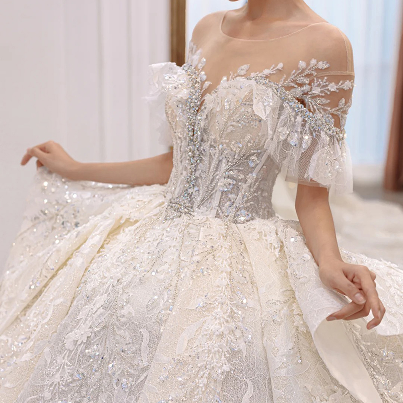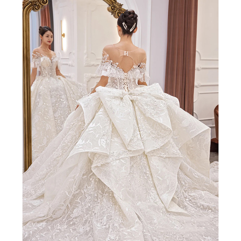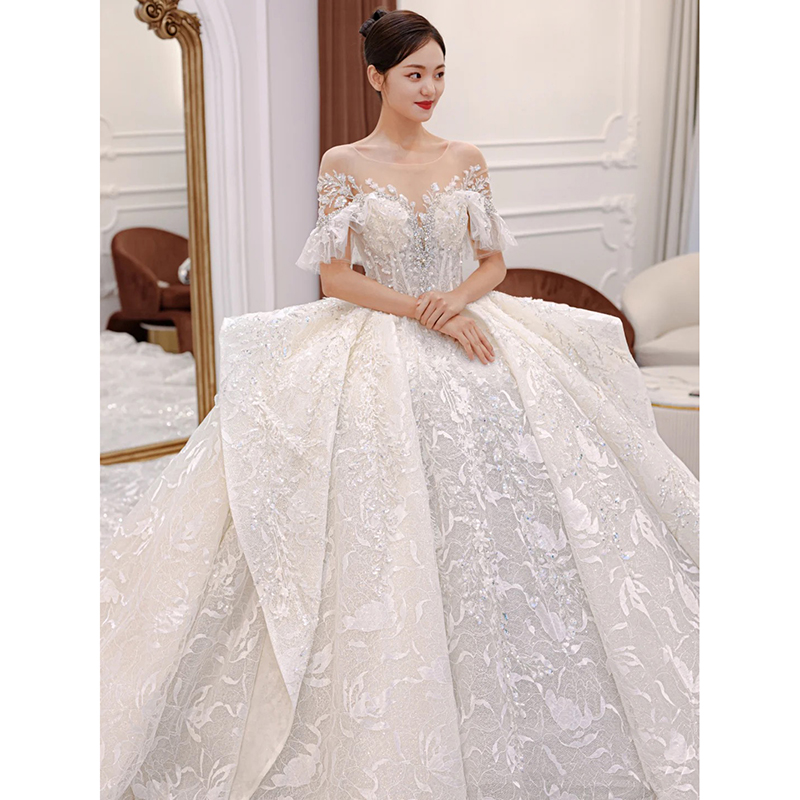Main Wedding Dress Gown 2022 New Temperament Bride Small Sub-Style Heavy Work With A Shoulder Luxurious High-end Trailing Light