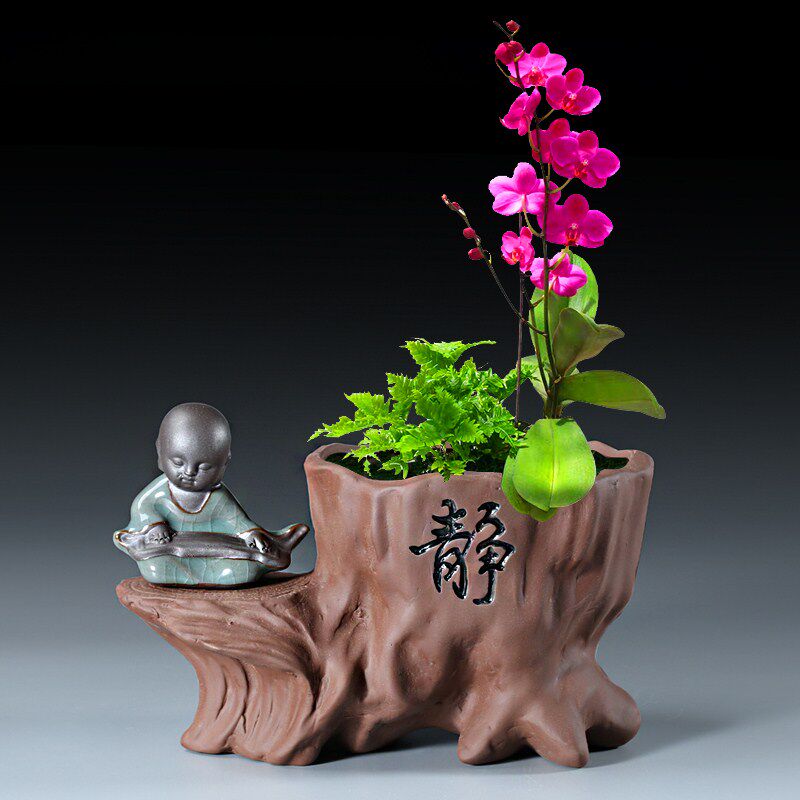 Zisha ceramic flowerpot creative combination Wenzhu potted living room desktop Zen small monk ornaments calamus retro pot