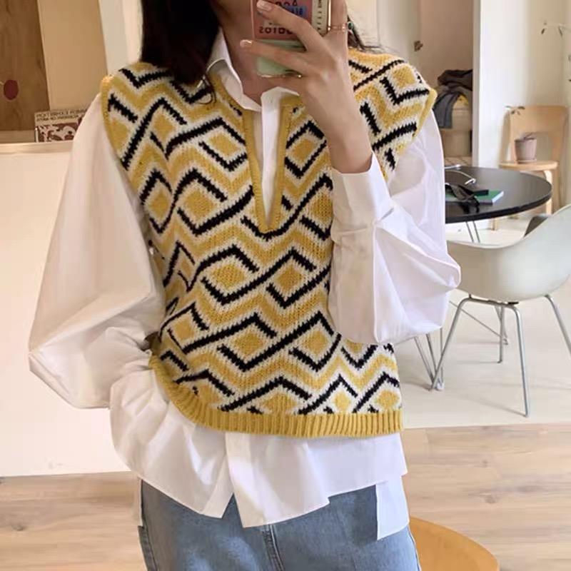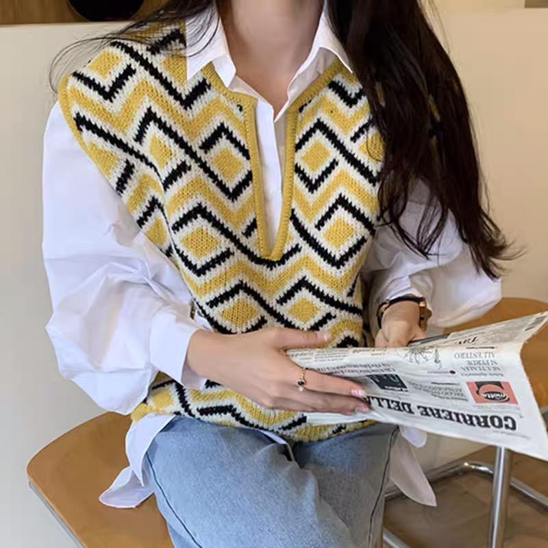 Two-piece suit single piece Korean minimalist design sensation small V neckline sweater horse chia bubble sleeve t shirt blouses (15 days