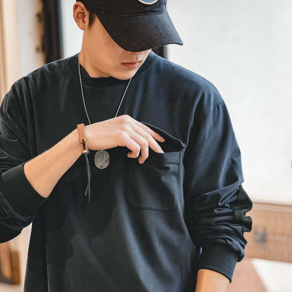 Maden tooling American retro long sleeve T-shirt suede suede splice pocket loose round collar sweatshirt fall shoulder sleeve men-Taobao