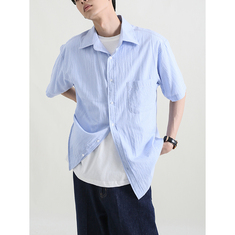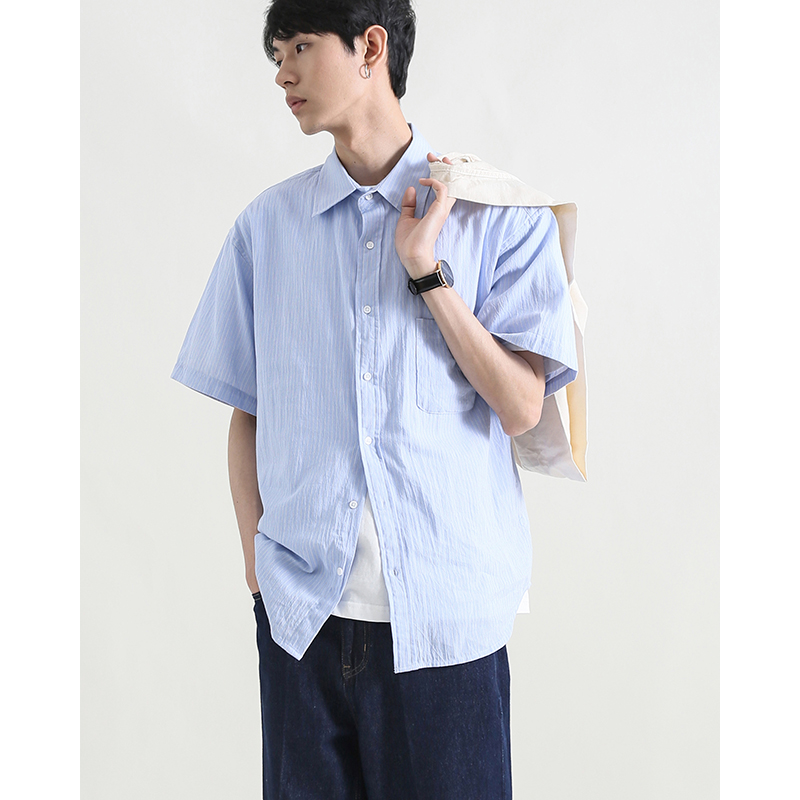MOREFANS Korean version loose striped cotton thin short-sleeved light blue shirt summer men's trendy shirt