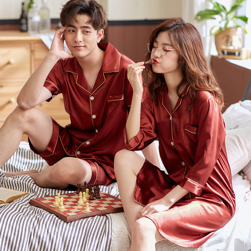 Japanese couple pajamas women's summer thin ice silk nightdress men's large size Silk Home suit cardigan short sleeve set