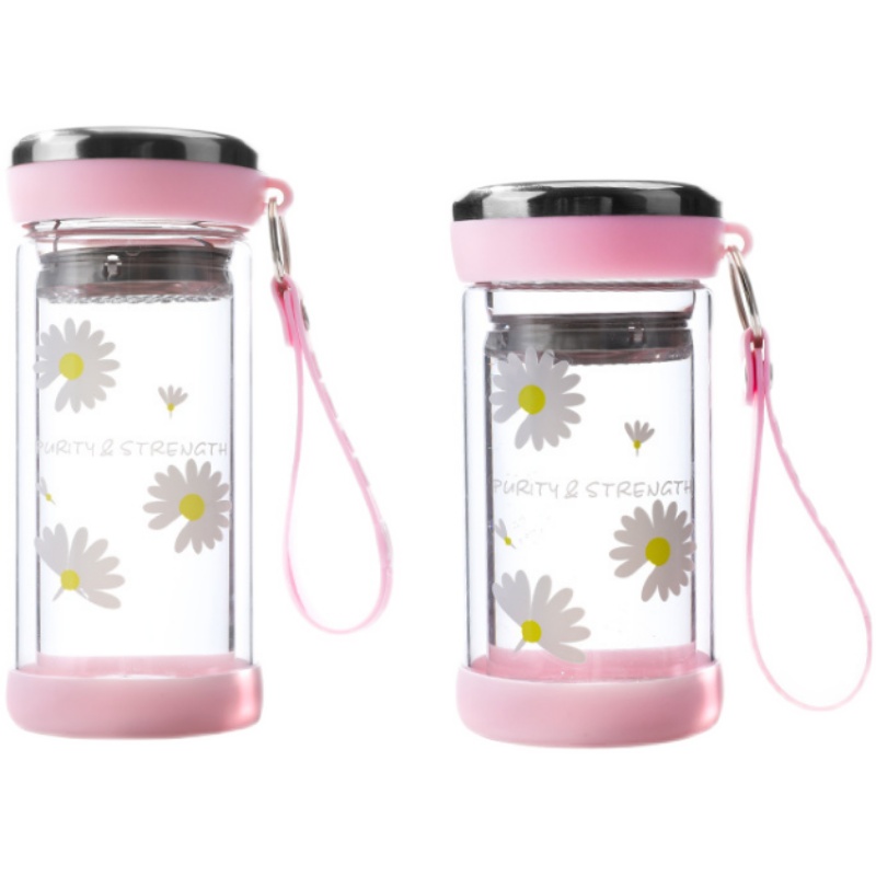 Small daisy double-layer glass transparent with cover net red water cup Round teacup portable cute schoolgirl custom