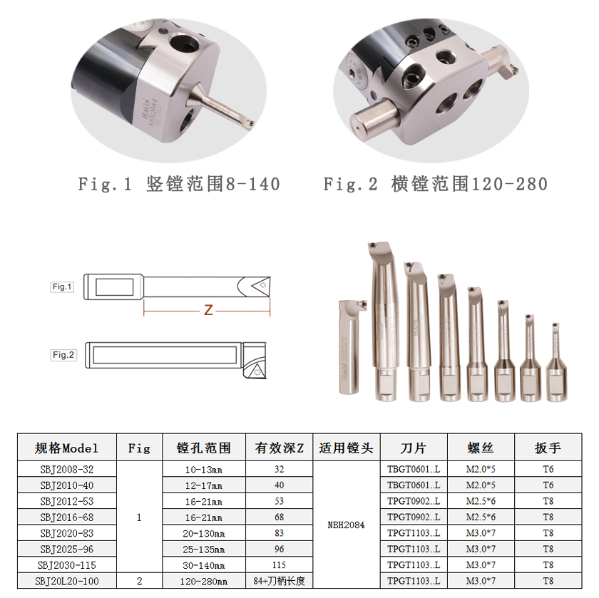 NBH2084 --- Single fine boring head HSK100A boring body) without shaft HSK100A-NBH2084 set) Contains 8 vertical boring rod 2008-32 (8-11) vertical boring rod2010-40 (10-13) vertical boring bar 2012-53 (12-17) vertical boring rod2016-68 (16-21) vertical boring rod 2020-83 (20-130) vertical boring rod 2025-96 (25-135) vertical boring rod 2030-115 (30-140) boring rod 20L20-100(120-280)