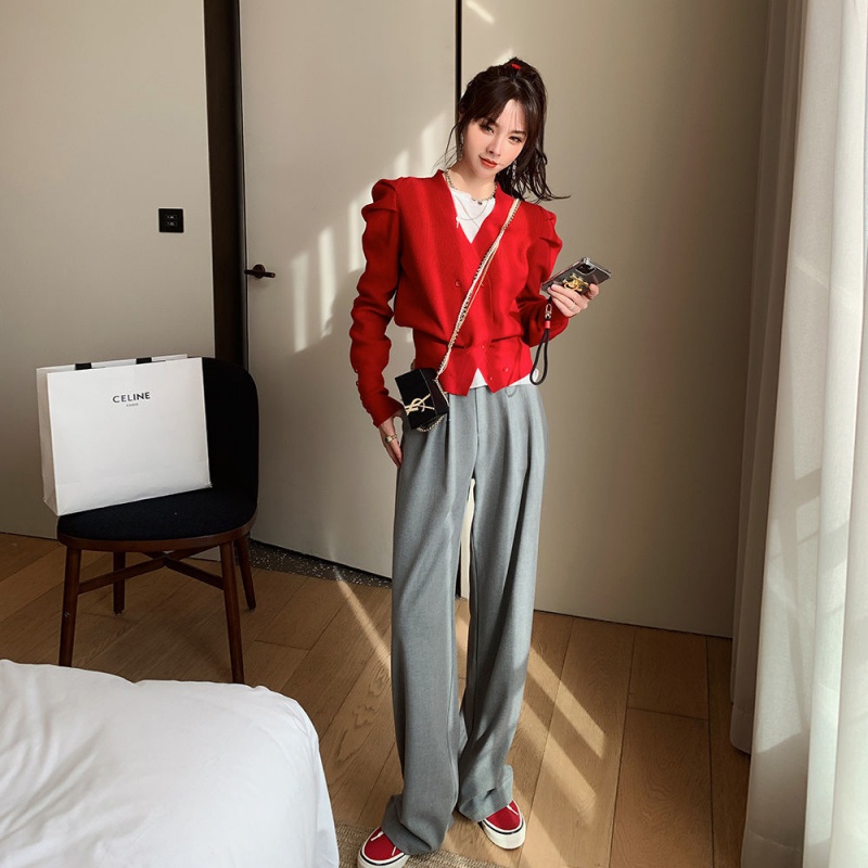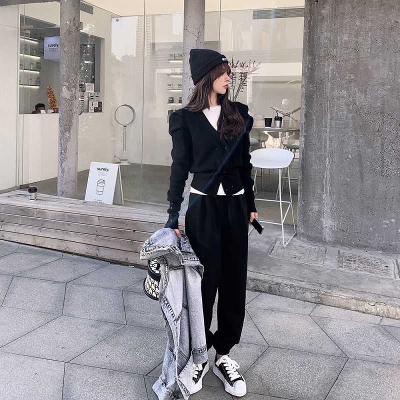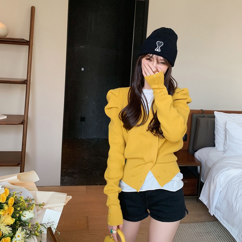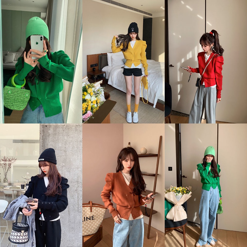 2021 spring new short double-row buttoned candy color knit cardiovert woman bubble sleeve V collar design sweater jacket