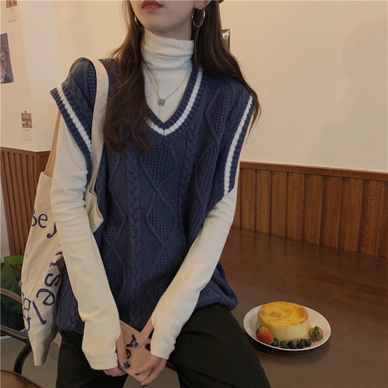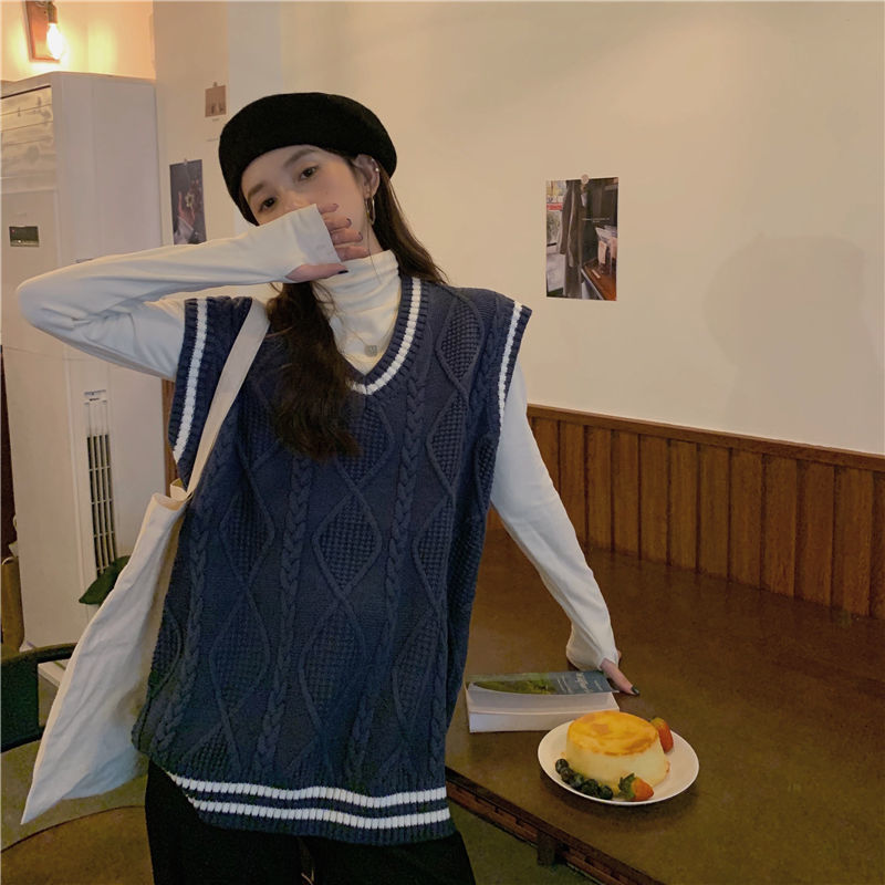 2021 springtime sweater waistcoat Korean version female outside wearing student loose V collar shoulder middle long version sleeveless jacket jacket