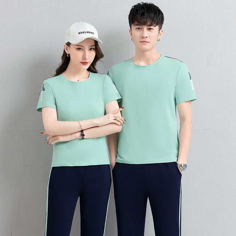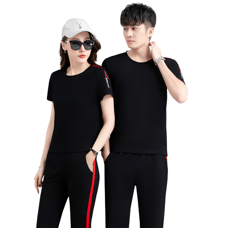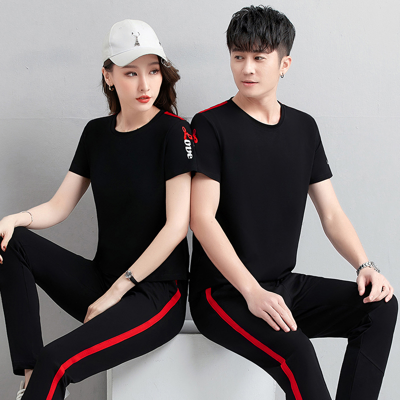 Summer lovers short sleeve long pants tracksuit suit men and women slim fit two sets large size circle collar running fitness pure cotton