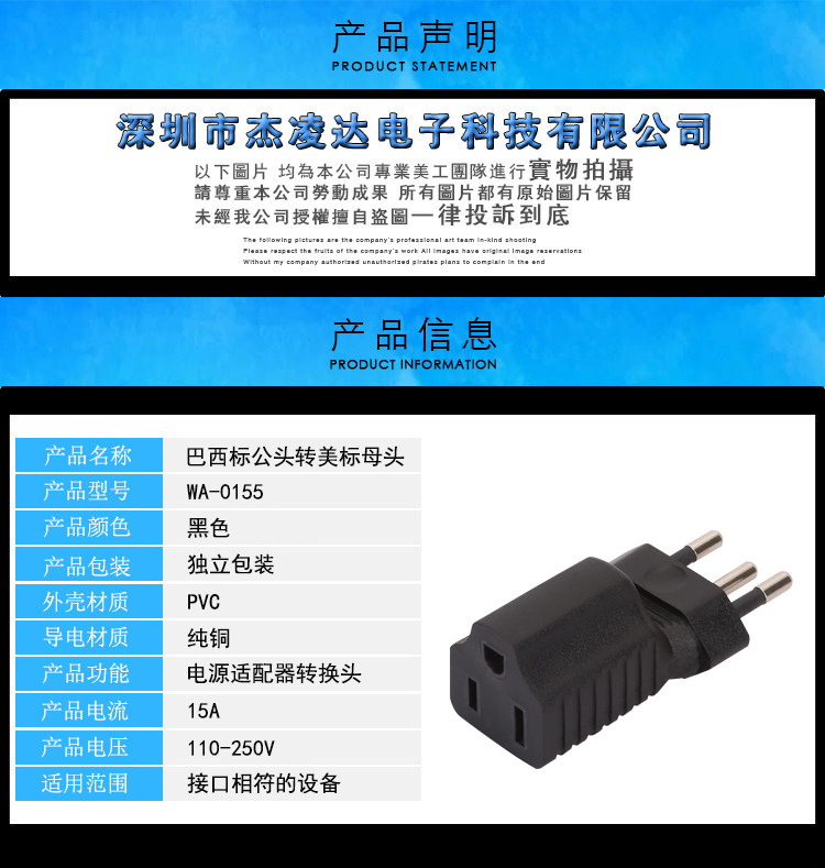 Brazil three-plug to American5-15R power conversion plug suitable for Brazil and other countries to adapt to the converter 15A