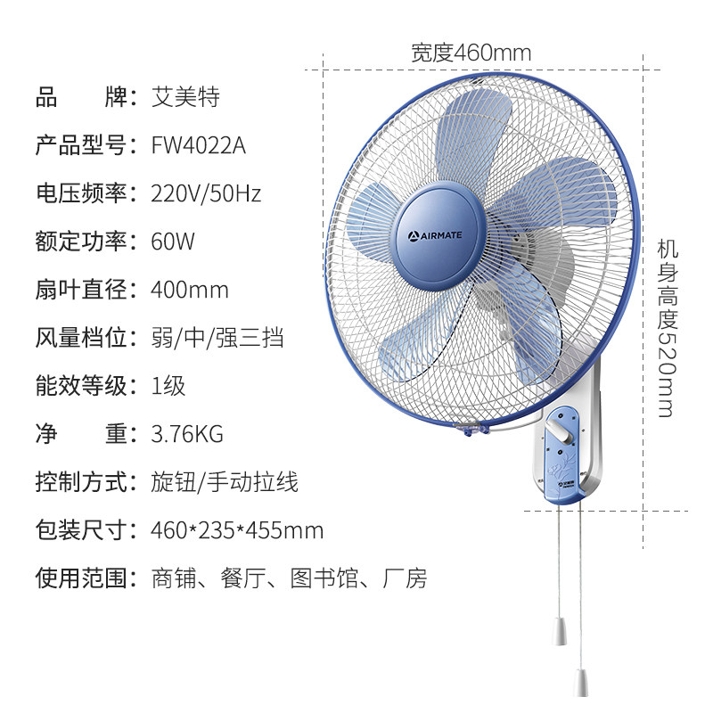 Emmett wall fan electric fan Household wall-mounted dining room dormitory fan Strong industrial electric fan