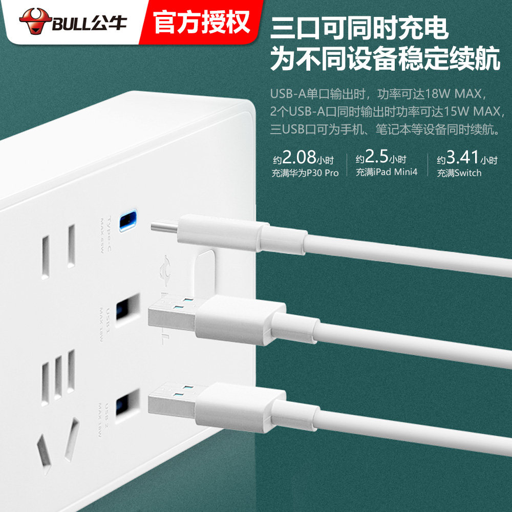 Bull Socket 65WPD Quick-charging USB power supply adapter Apple iphone12 mobile phone notebook computer plug-board