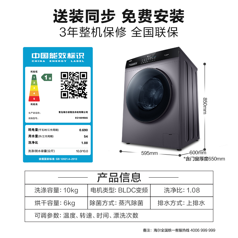 Haier 10 kg sterilization mite frequency conversion household automatic washing and drying integrated drum washing machine EG100HB6S