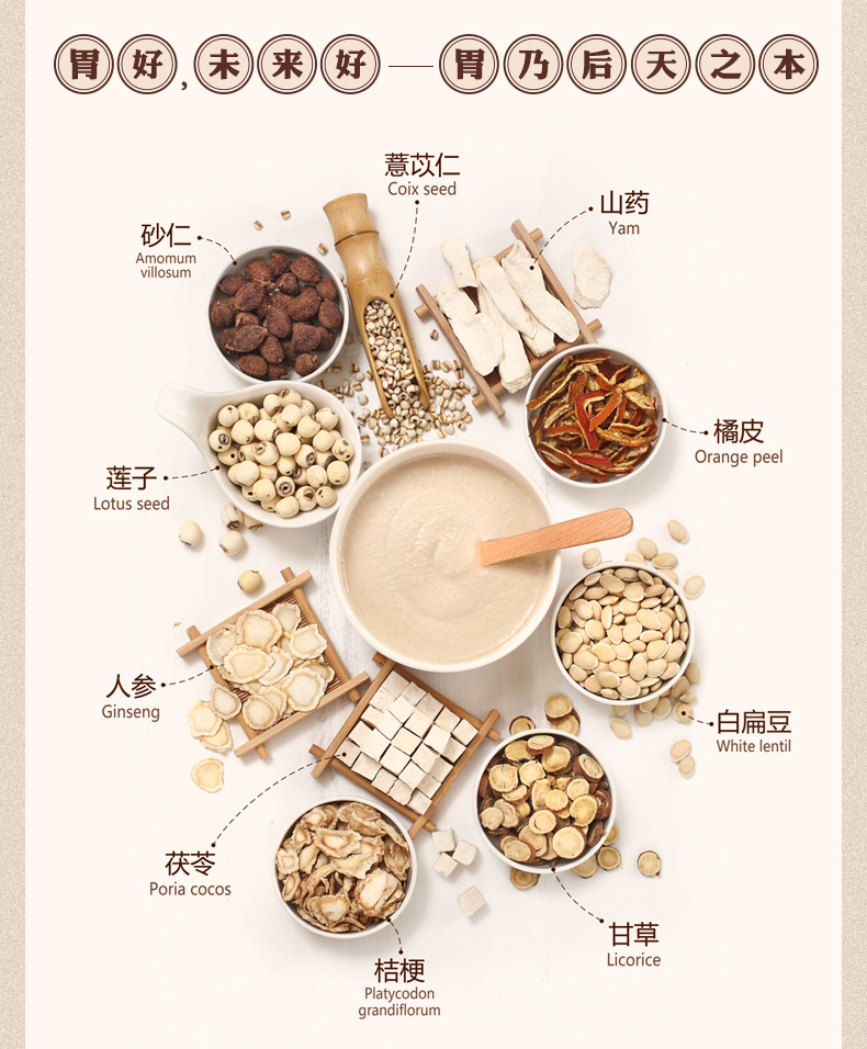 Non-glutinous rice oatmeal with white lentils, white lentils and lotus seeds, ginseng and liquorice orange peel platycodon grandiflorum
