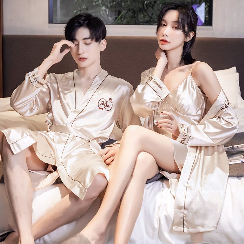 Summer ice silk sleepwear lovers Long sleeves loose with large size silk suit Bathrobe embroidered Korean version of women's home for spring and autumn