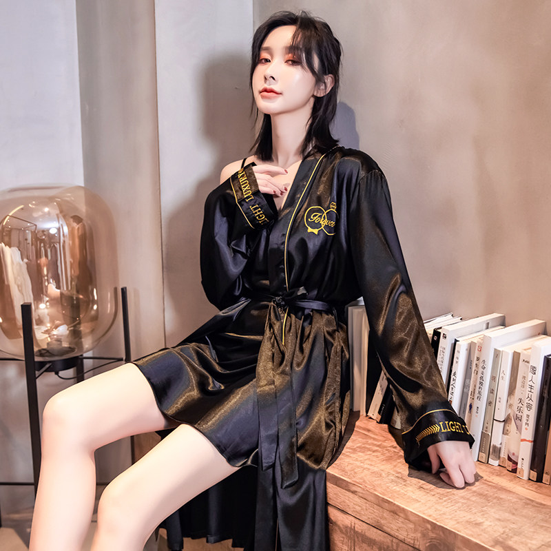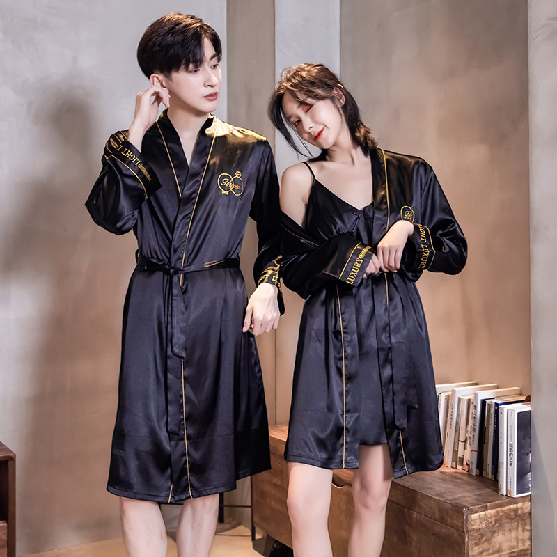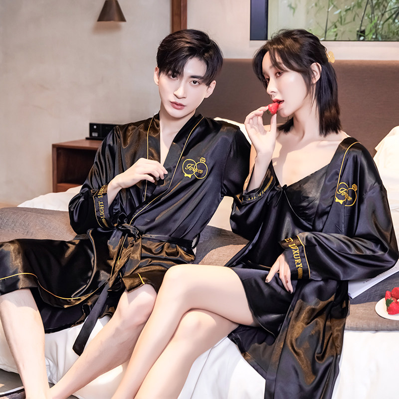 Couple pajamas silk Korean version of thin embroidery casual large size loose morning robe bathrobe suit summer home wear Men