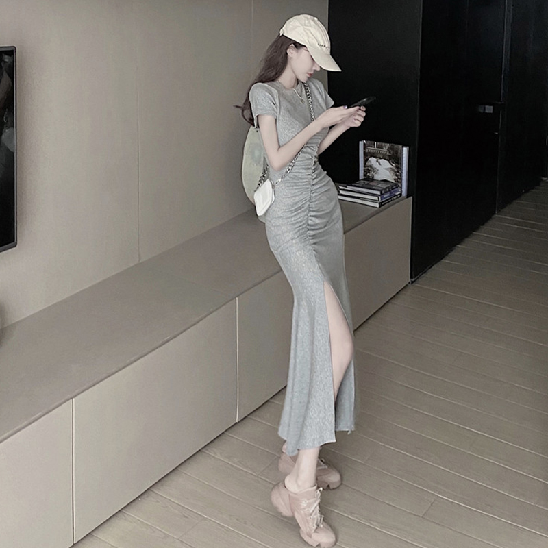 2021 summer new irregular split dress women's retro high waist thin hip long skirt to the ankle