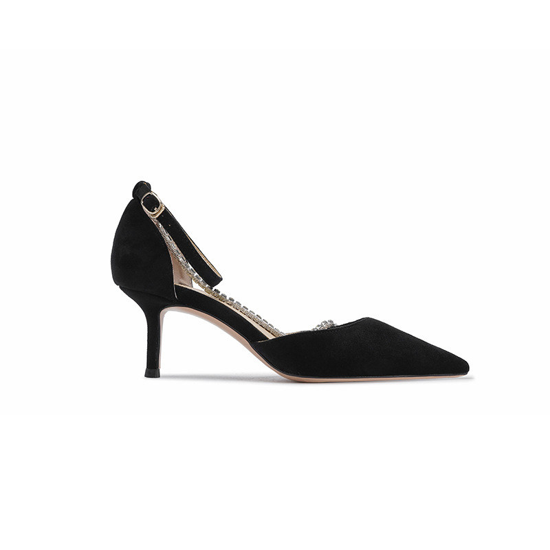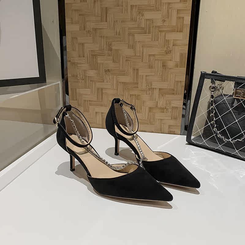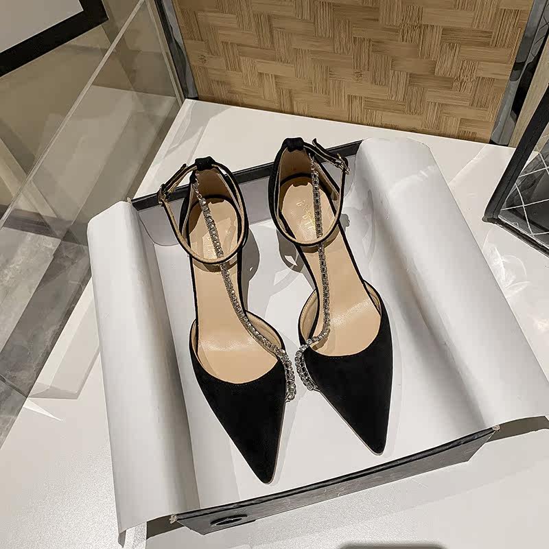 2021 fairy style buckle stiletto high heels women's rhinestone pointed bag shoes black hollow toe sandals