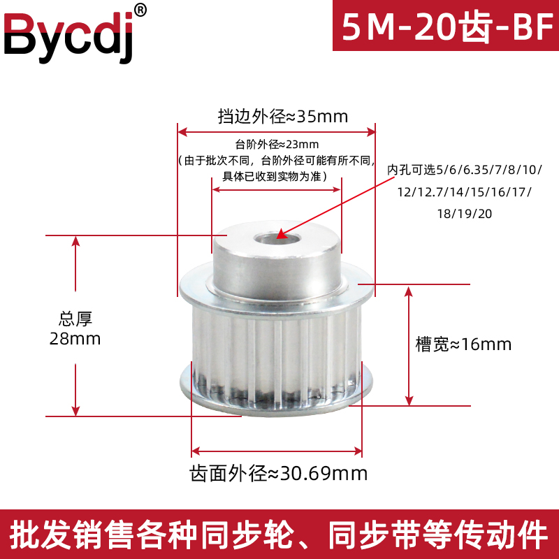 Synchronous wheel 5M 20 teeth T groove width 16 BF type convex step finishing inner hole 5-20 aluminium alloy small belt pulley