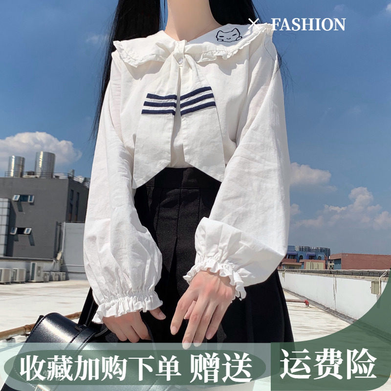 Japanese soft sister 2022 autumn new wooden ear love cat embroidery big leads a hundred shirts