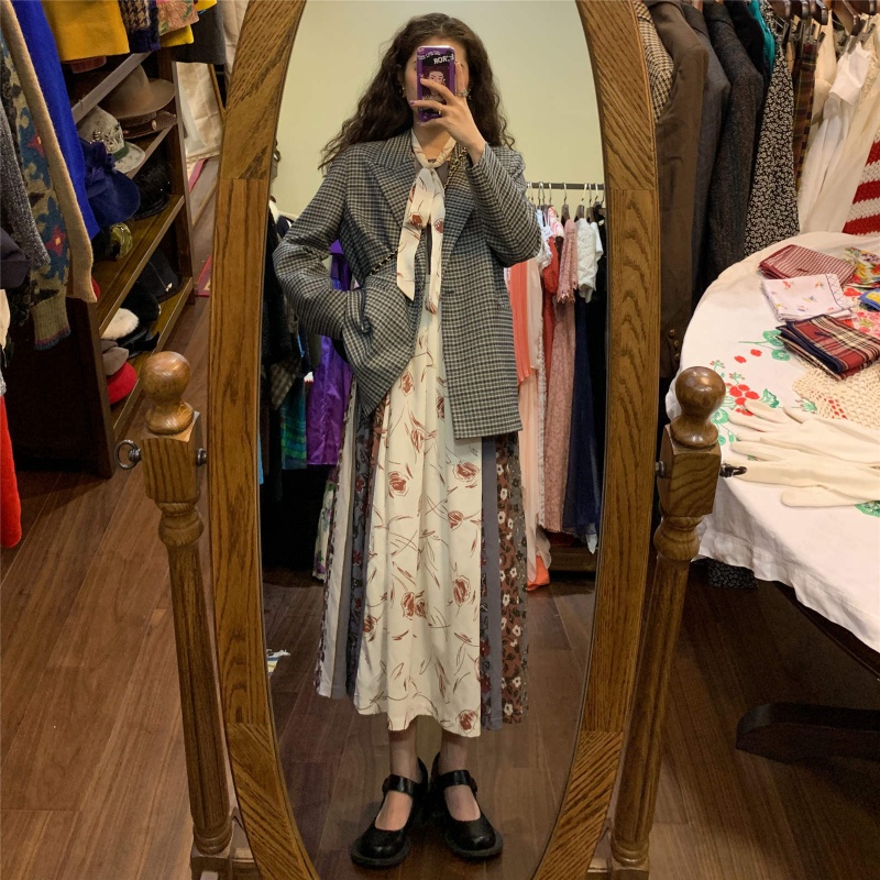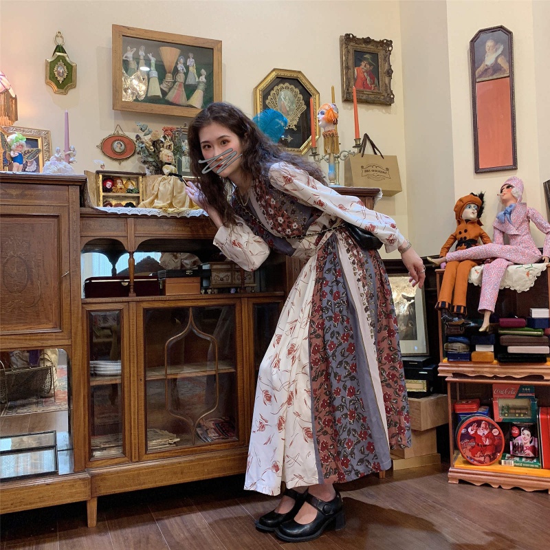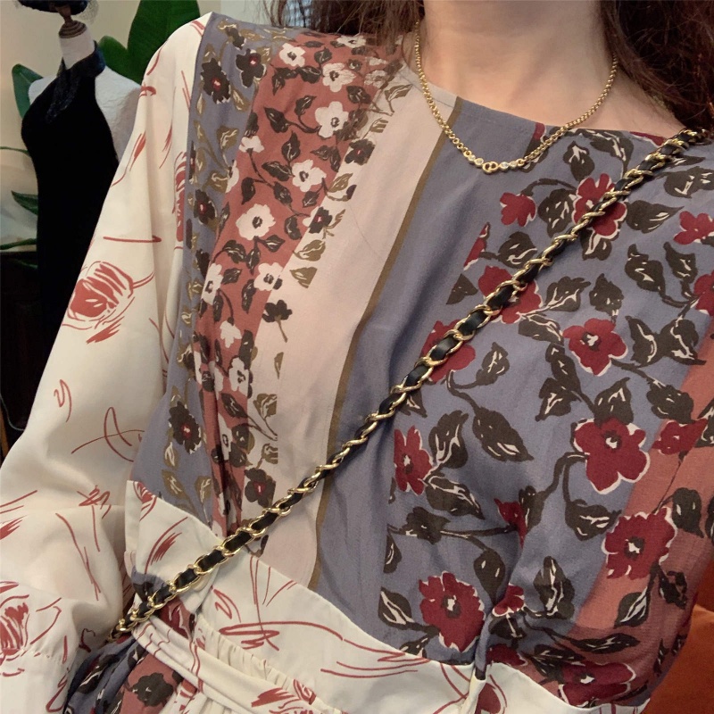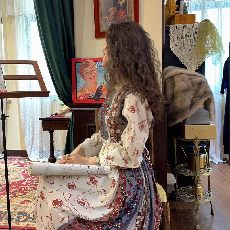 2021 spring new Korean style French waist design mid-length skirt stitching long retro floral dress women