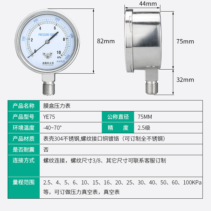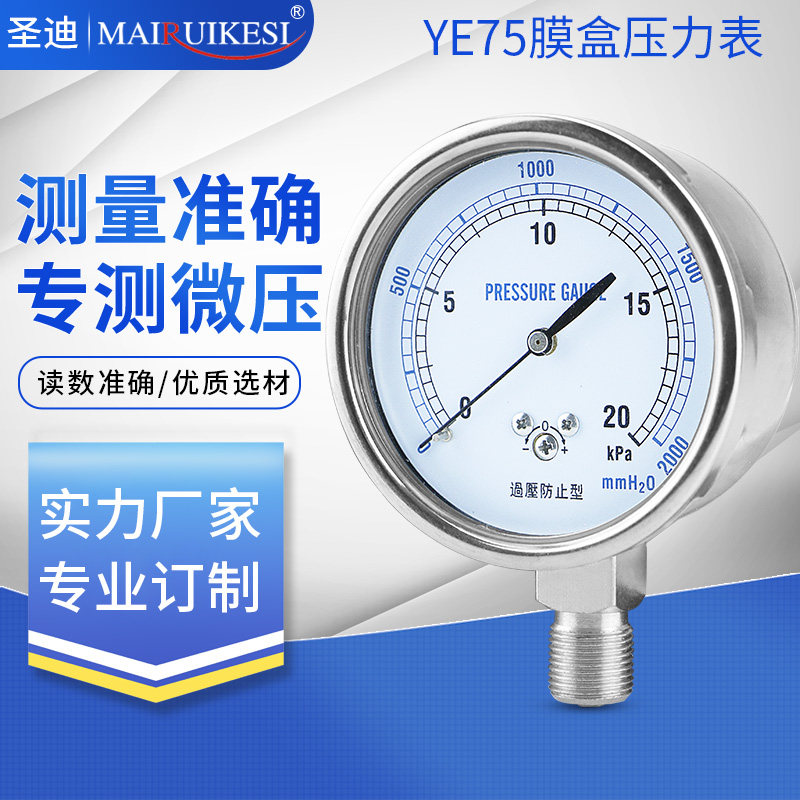 Membrane Case Pressure Meter YE75 Negative Pressure Gauge Gas Meter Overpressure Prevention Type Micropressure Gauge 0-20KPa Kpa Meter