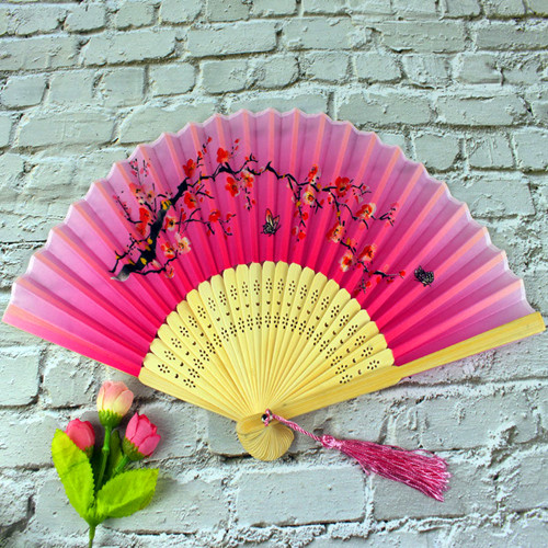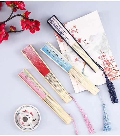 Chinese wind student damask silk cloth bamboo folding fan female Hanfu national cheongsam dance tassel fan summer cool gift
