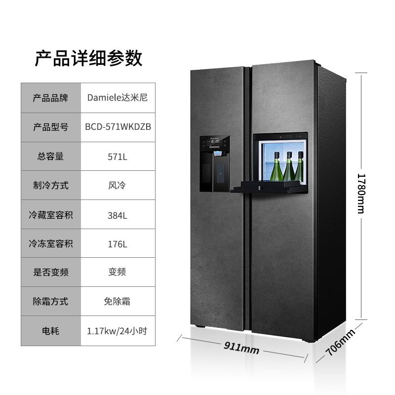 British damini fridge 571L Automatic ice-making refrigerator double door water bar frequency conversion Home All with ice bar