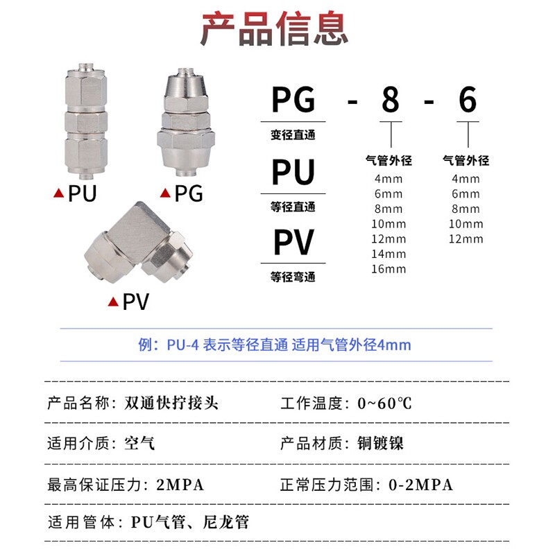 Pneumatic trachea copper quick twist joint double-pass PU variable diameter double-pass PG elbow double-pass PV pneumatic components 6 8 10