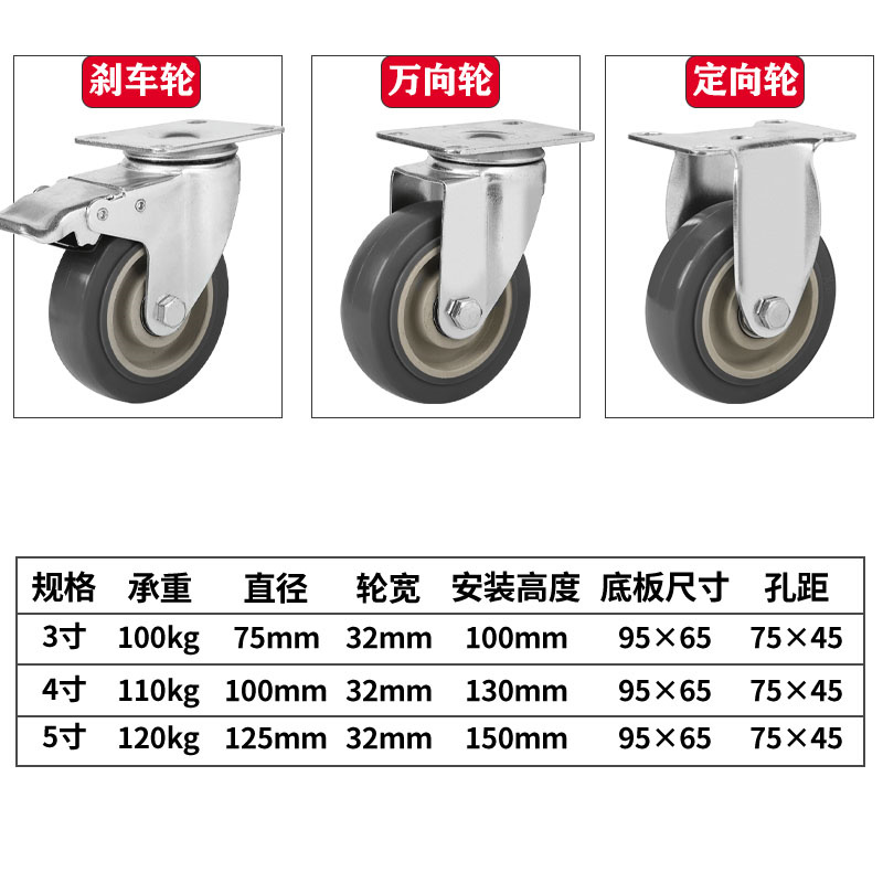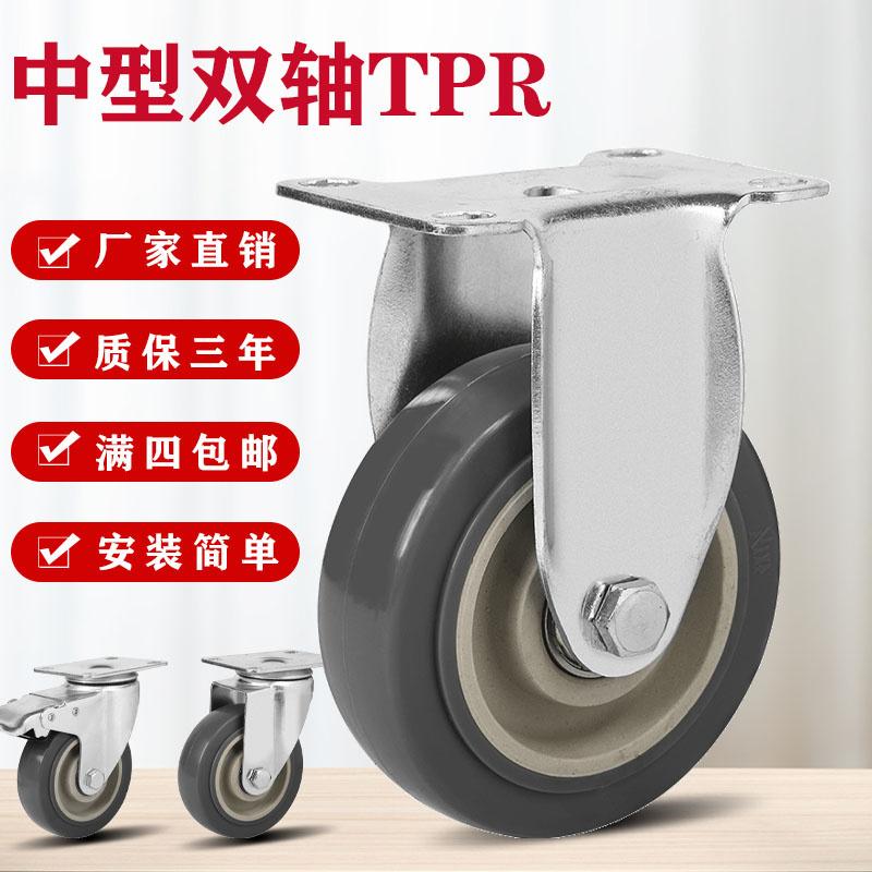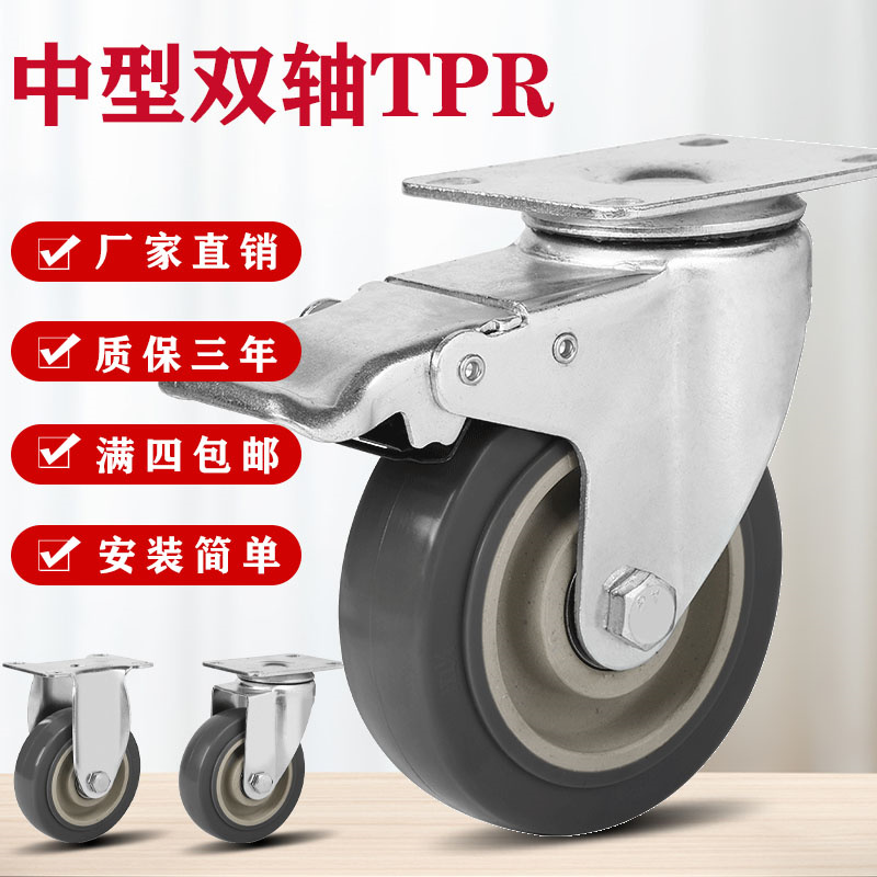 Medium double bearing castors 3 inch 4 inch 5 inch universal wheel grey rubber TPR Soft rubber muted wheel abrasion resistant with brake