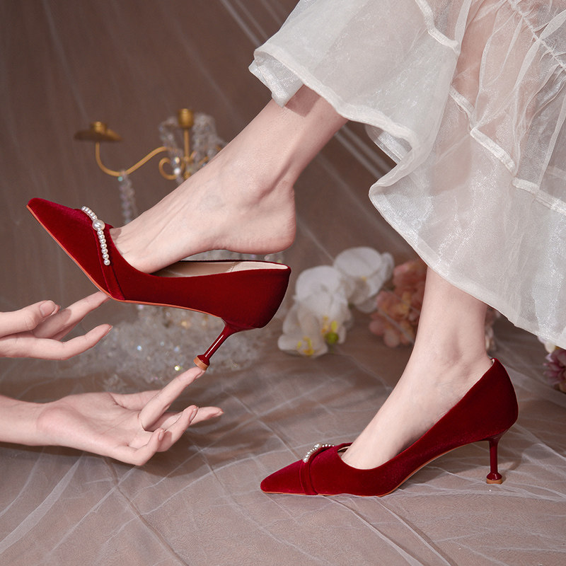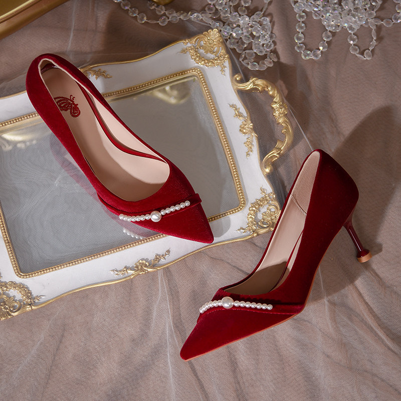 Xiuhe shoes wedding shoes can usually wear Chinese bridal shoes suede wine red high heels women's wedding stiletto pearl shoes
