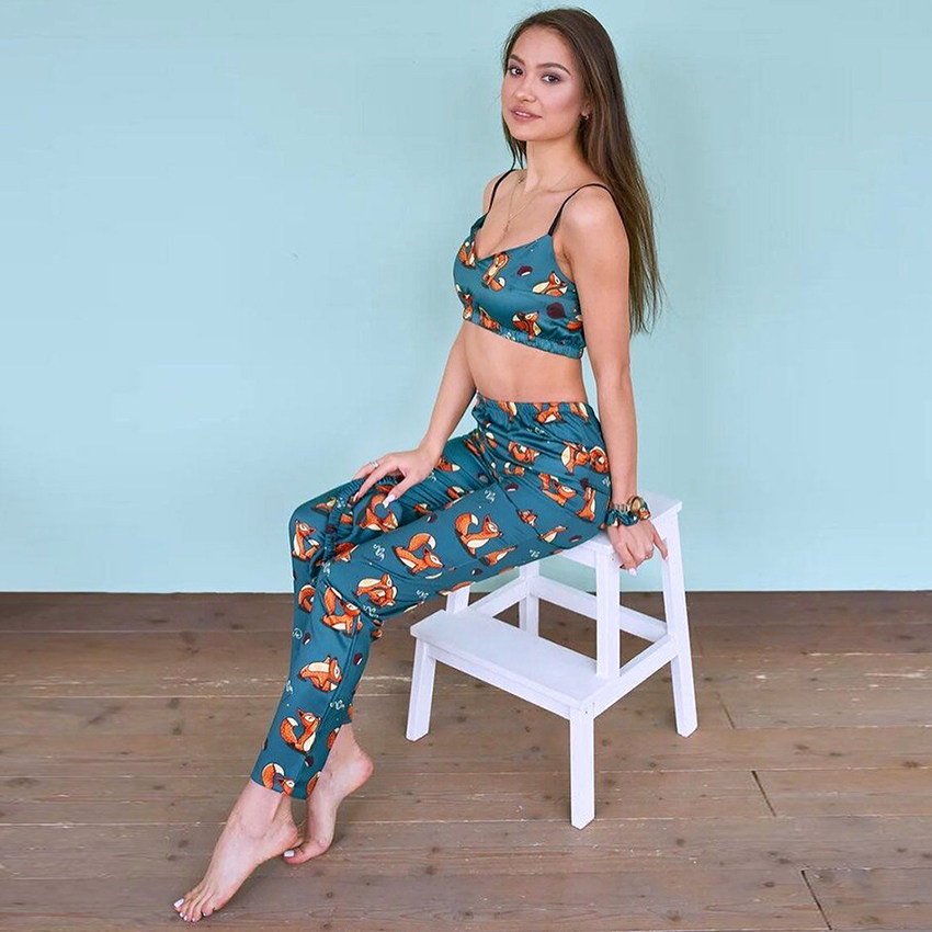 Suphis Spaghetti Strap Fox Pajamas Print Summer Two Piece S