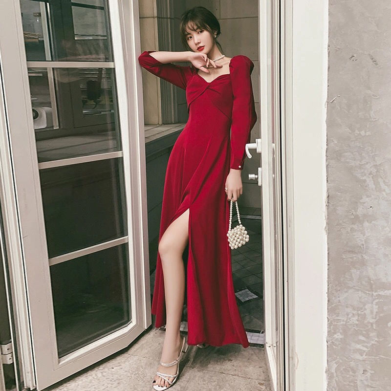 Spring and autumn new French vintage red square collar dress medium long foreign air waist thin small dress skirt tide