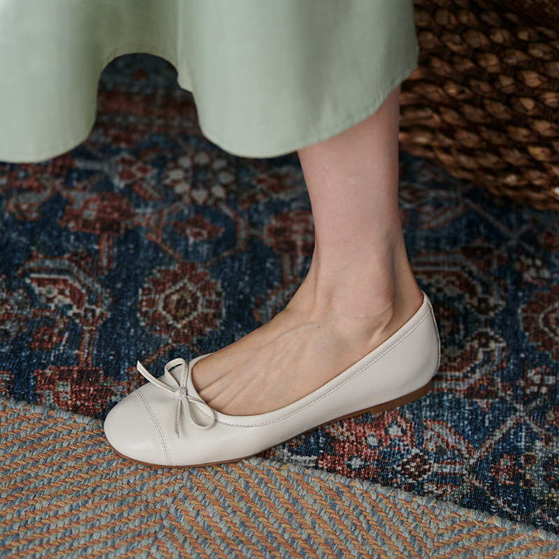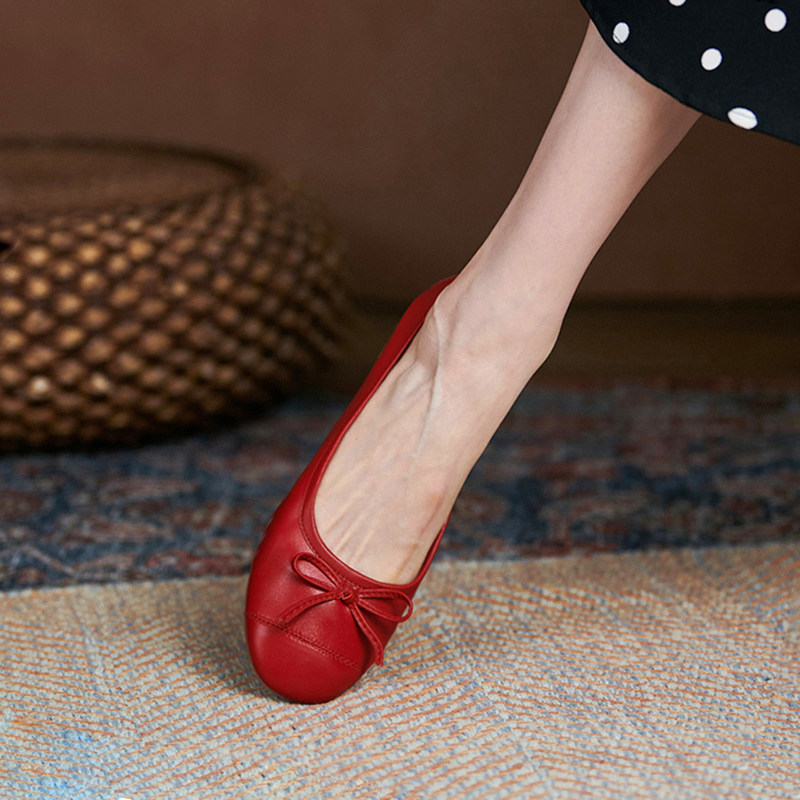 Leather flat shoes women's soft leather comfortable shallow mouth round head bow red evening evening wind gentle shoes ballet shoes