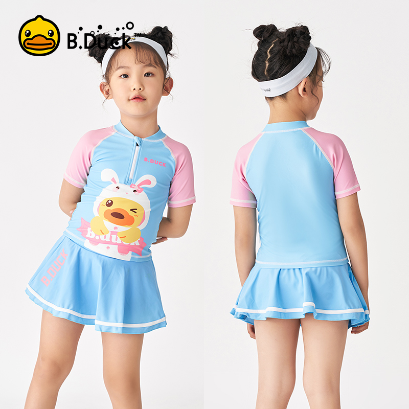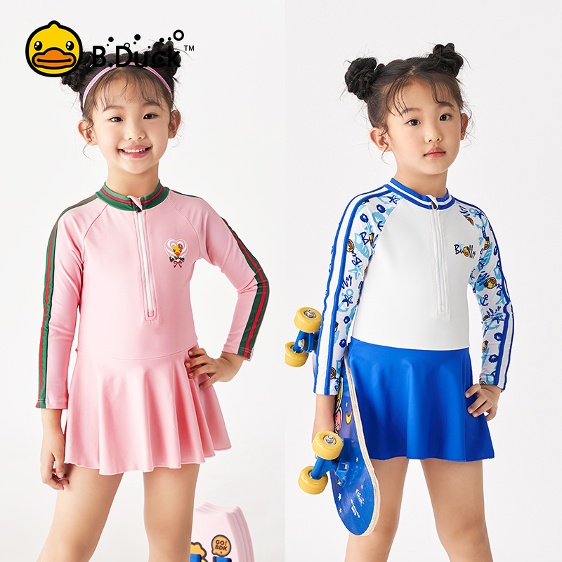 B Duck little yellow duck children's swimsuit girl's cute princess one-piece dress girl baby long-sleeved split medium and large children