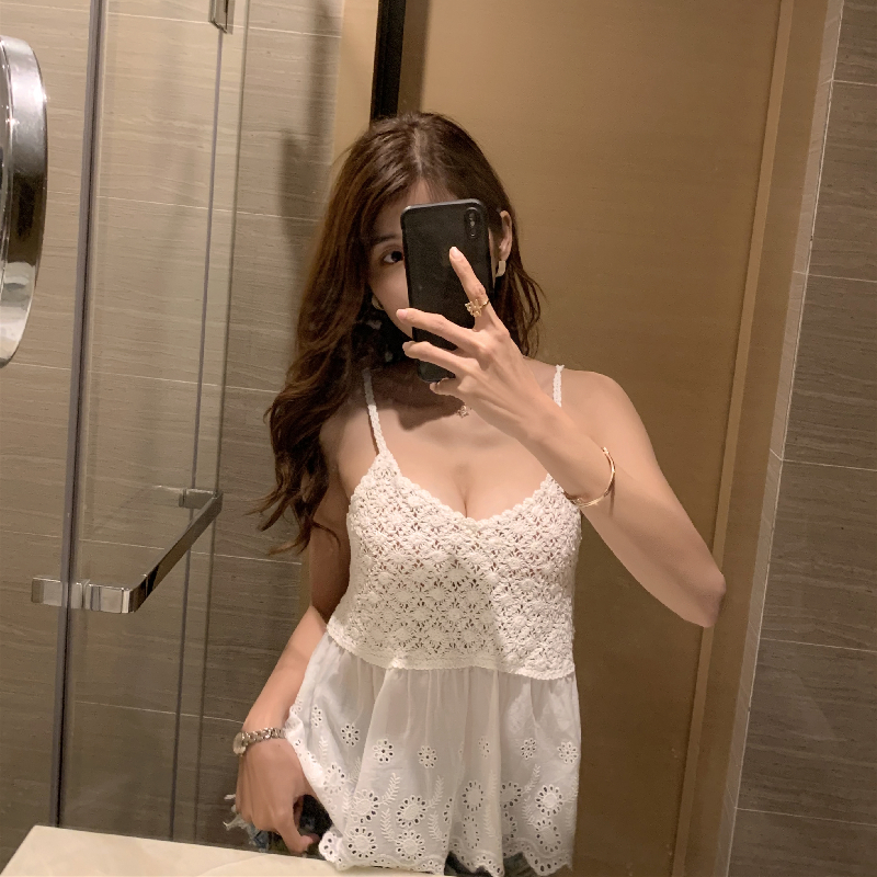 Pregnant summer sexy cutout lace small suspender vest women crochet sleeveless knit blouse short outer top