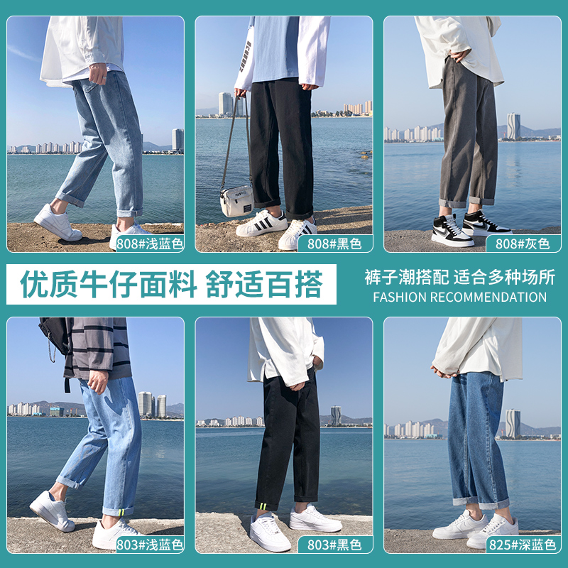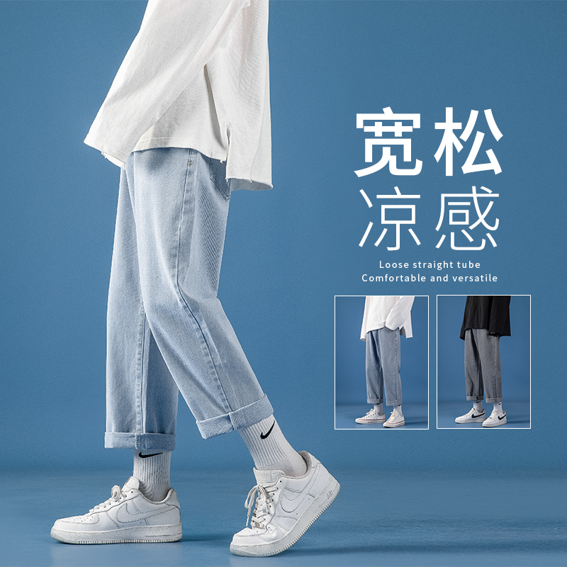 Jeans men's loose straight slim fit autumn nine-point pants light-colored men's tide brand wide-leg casual long pants summer