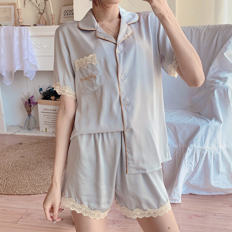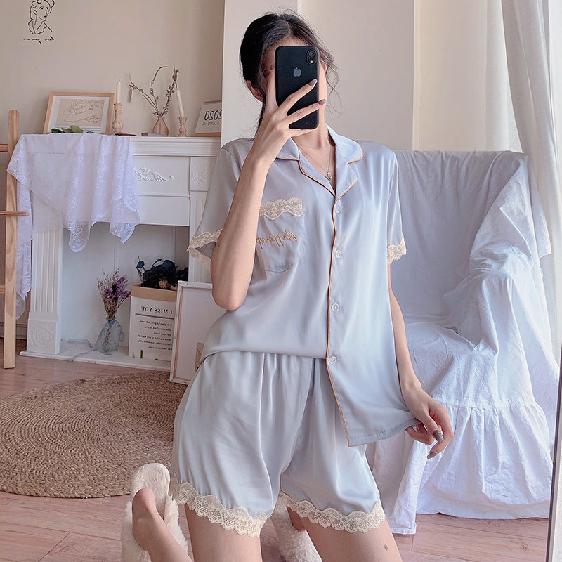 Sleepwear Female Summer Ice Silk Short Sleeves Ultra Slim Lace Floral Side Sexy Temperament Web Red Wind Method Emulation Silk Home Clothing