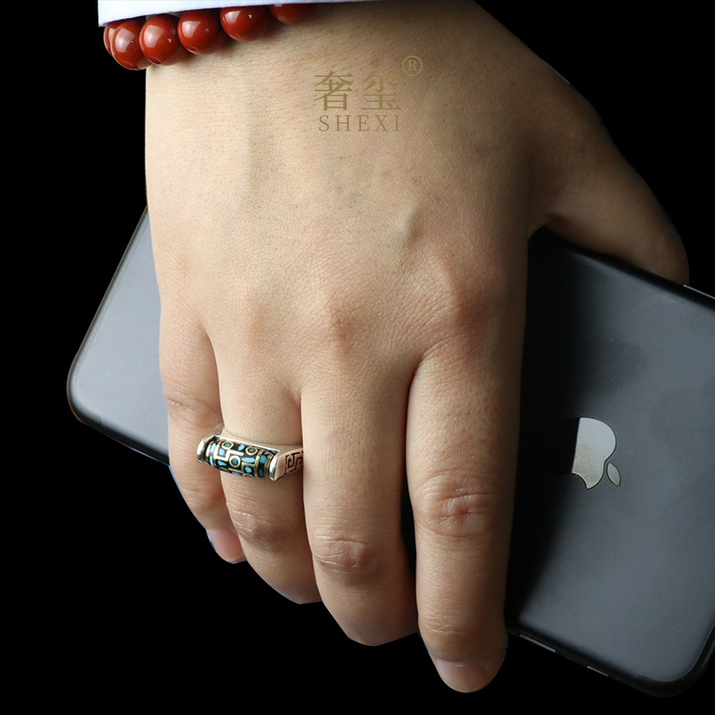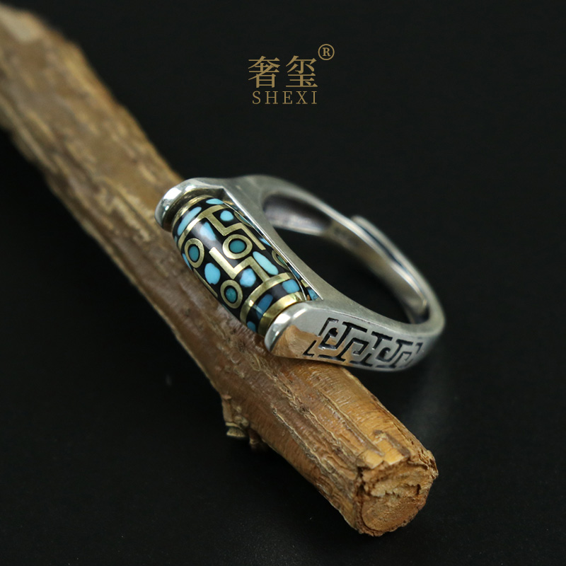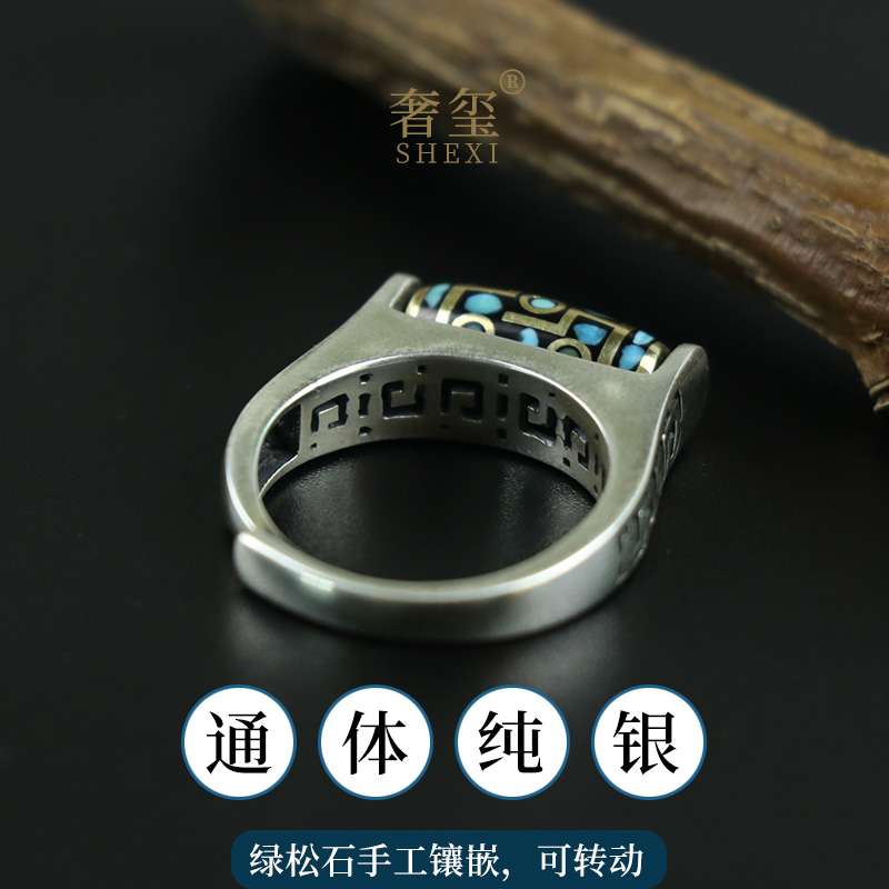 Nine - eye Tianan Ring 999 pure silver male and female retro - small - silver 6 words of natural original origin turquoise ring