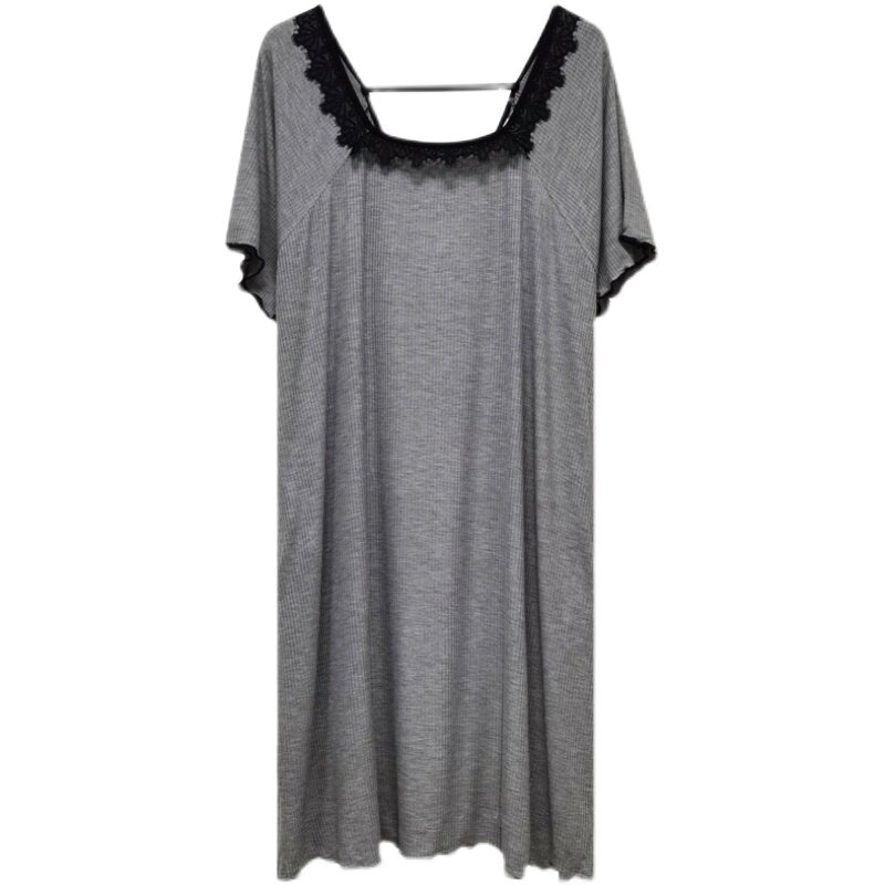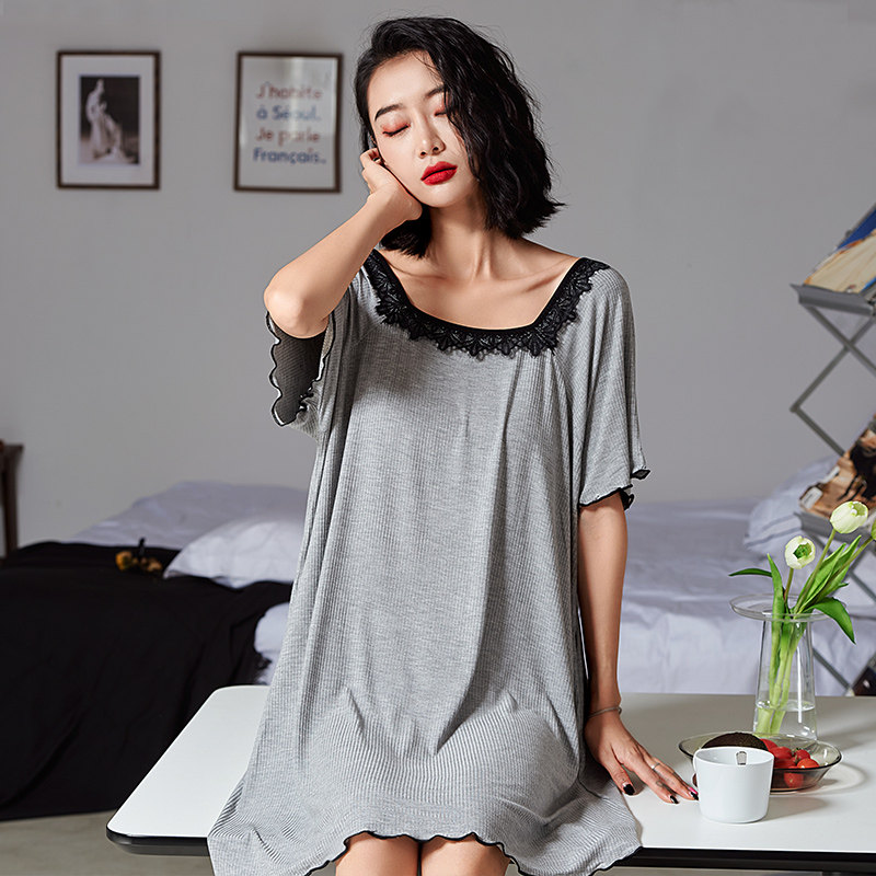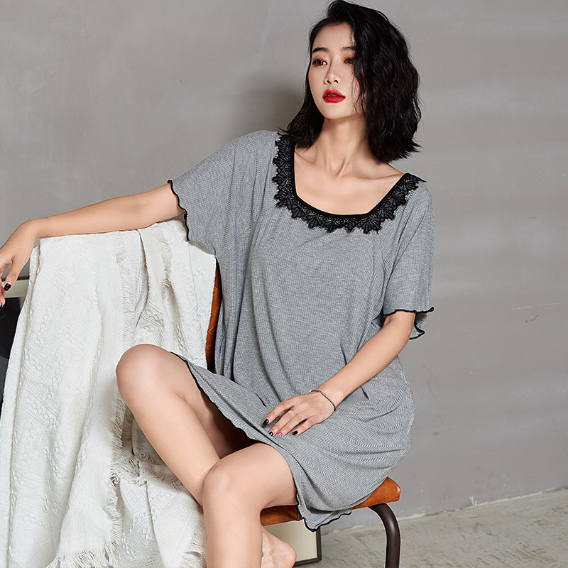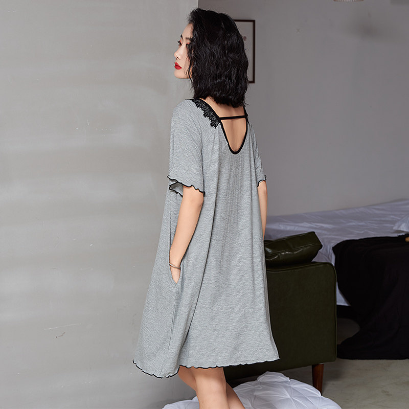 Modal cotton nightdress women's summer lace sexy backless thin section square collar short-sleeved mid-skirt pajamas summer gray