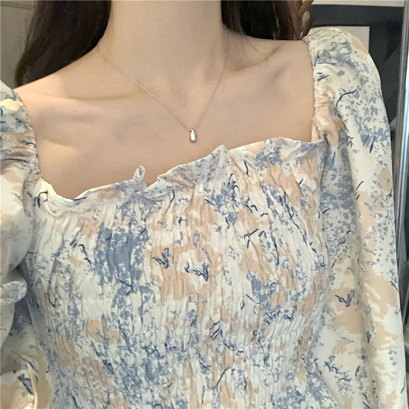 2022 New Spring Fast-style small crowdsourced Collar Crushed Flower Lined with Shoulder Snow-spinning Jersey Woman High Waist Short blouses
