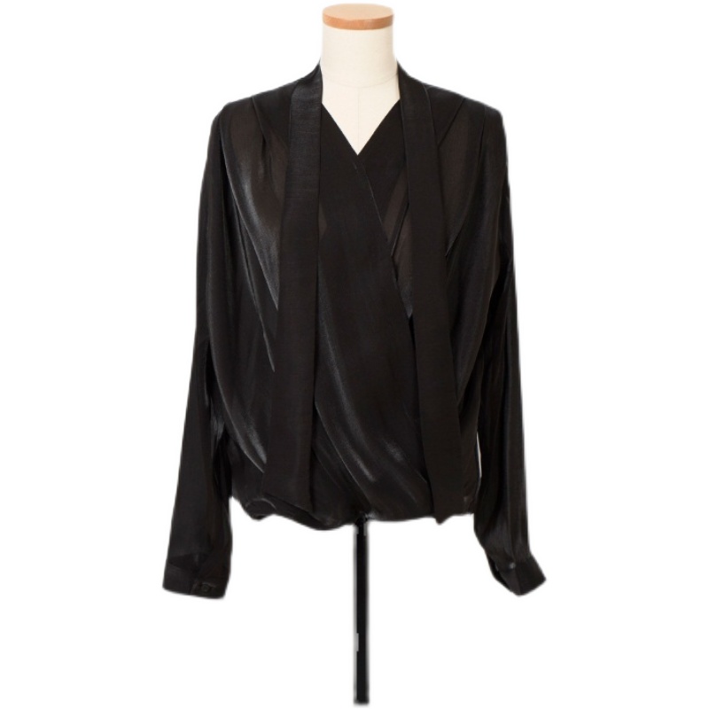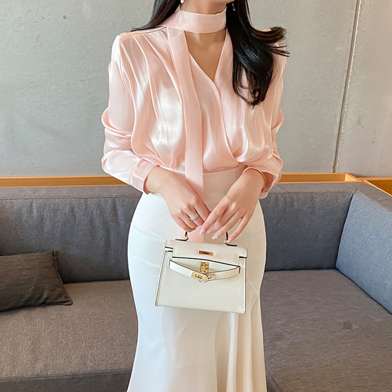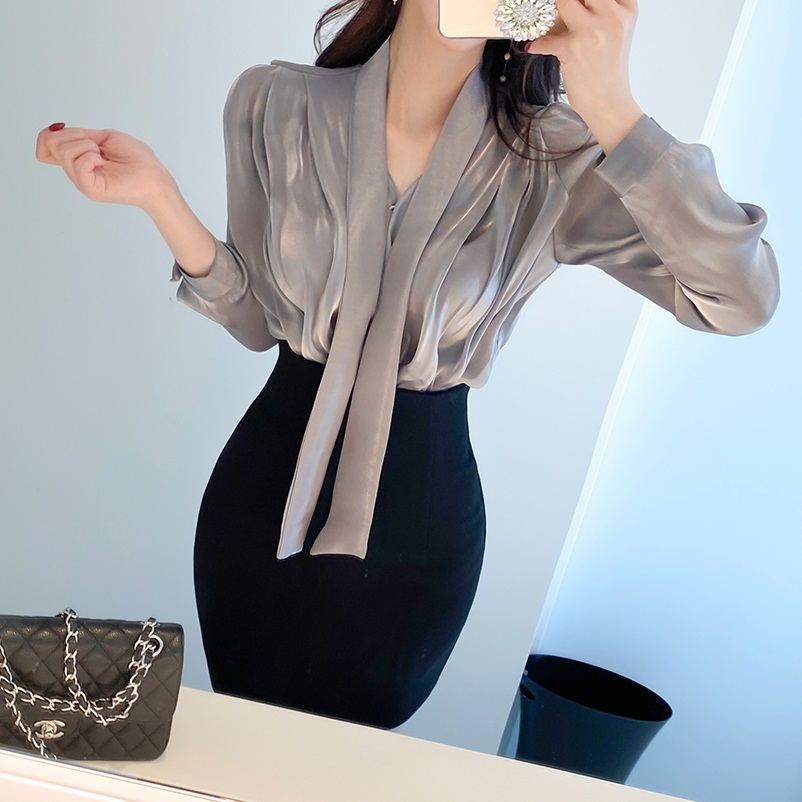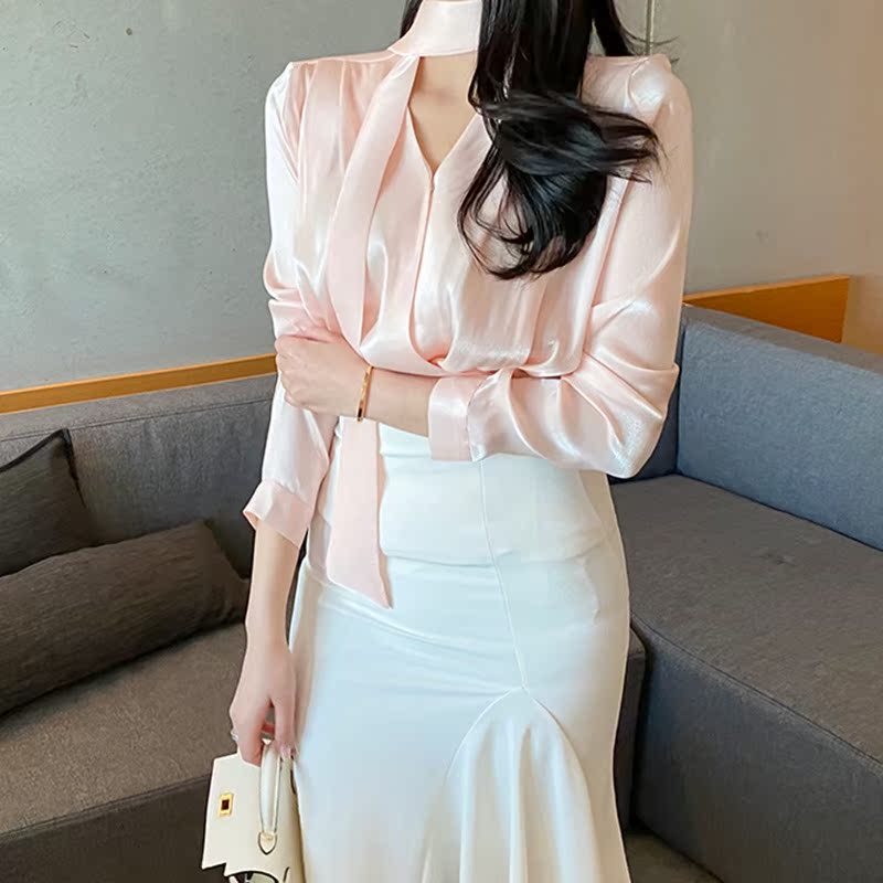 Tie inclined fork lead satin long sleeve shirt lady Spring loaded with new shirt jacket head commute South Korea