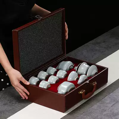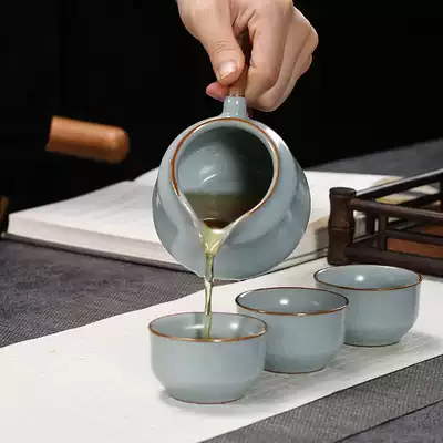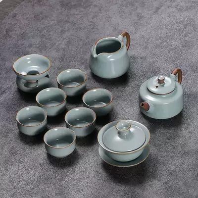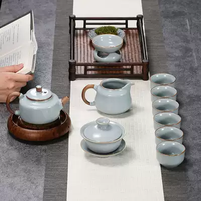 Ruyao tea set set set Ru porcelain whole set of kung fu tea set Zhong De pot three can open the bowl can raise gold thread gift box