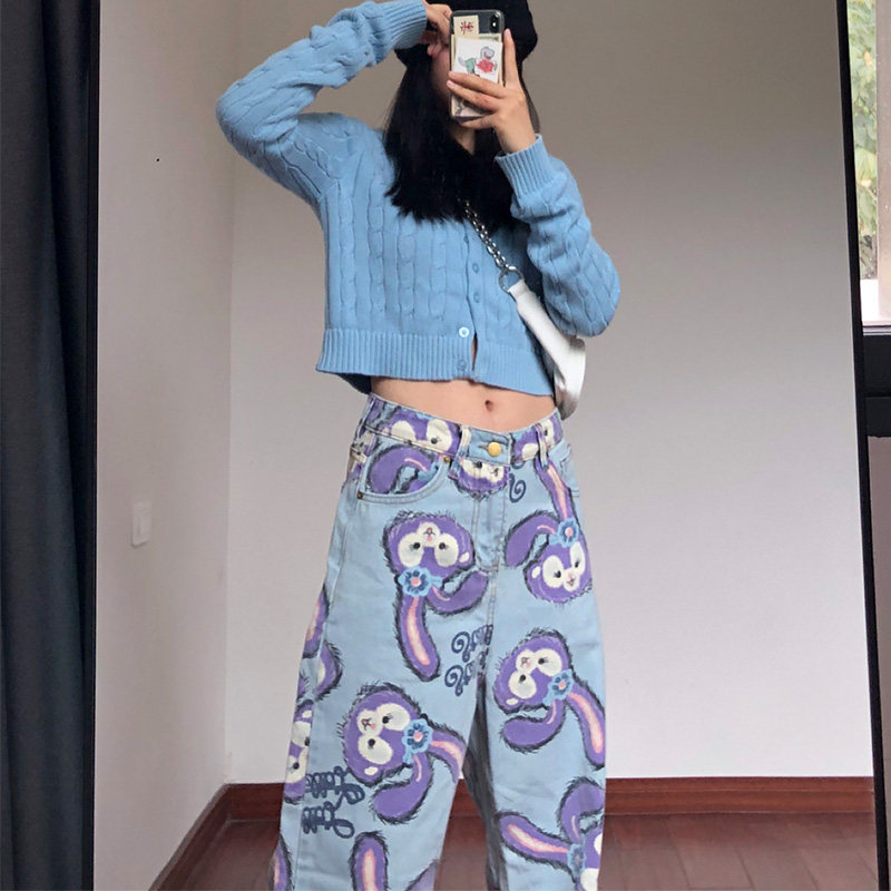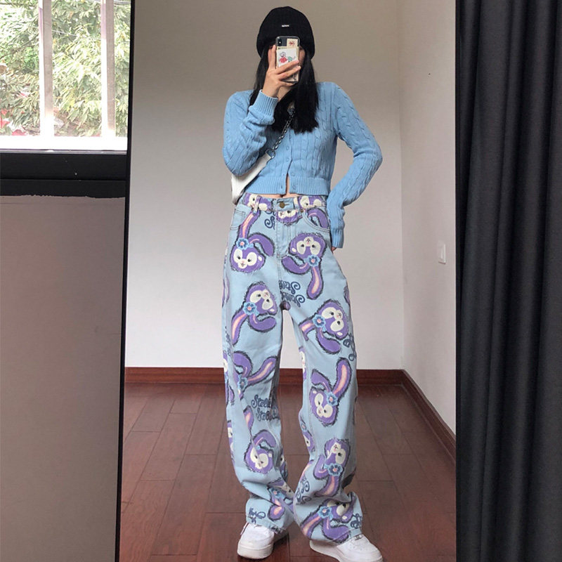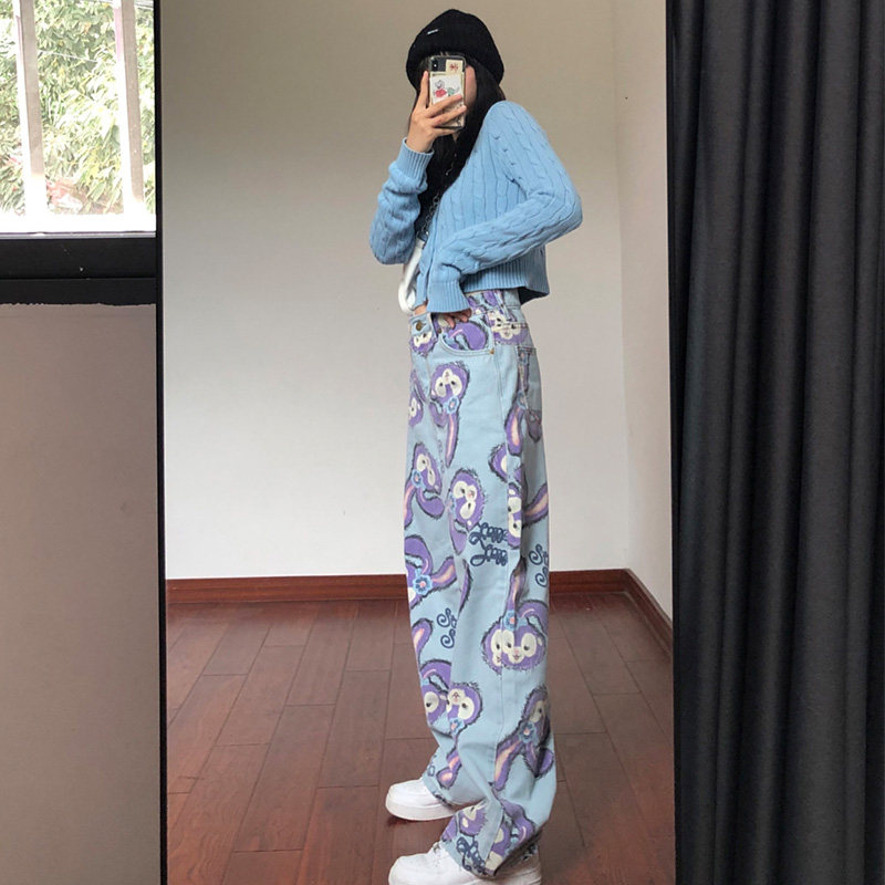 Ins trendy star Dailu full print rabbit wide-leg jeans women's straight loose high waist slimming daddy trousers
