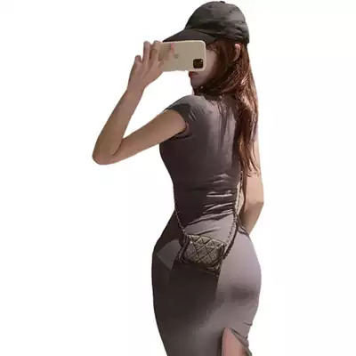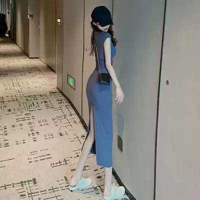 2021 summer Net red goddess slim body slim tight back slit sexy hip short sleeve dress woman to ankle