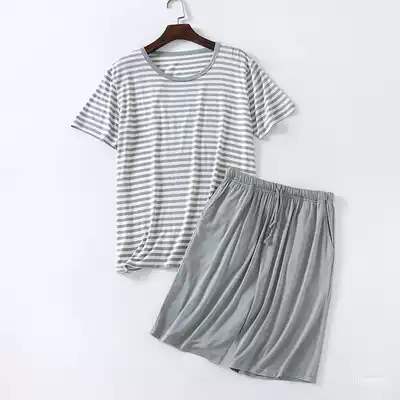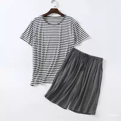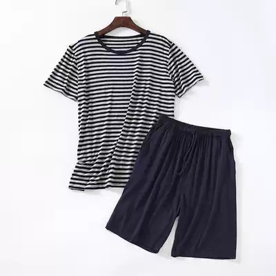 Modal men's pajamas summer short-sleeved shorts suit round neck striped T-shirt men's thin home clothes to wear outside