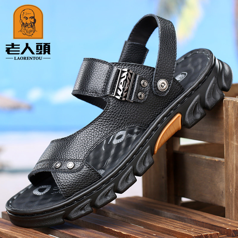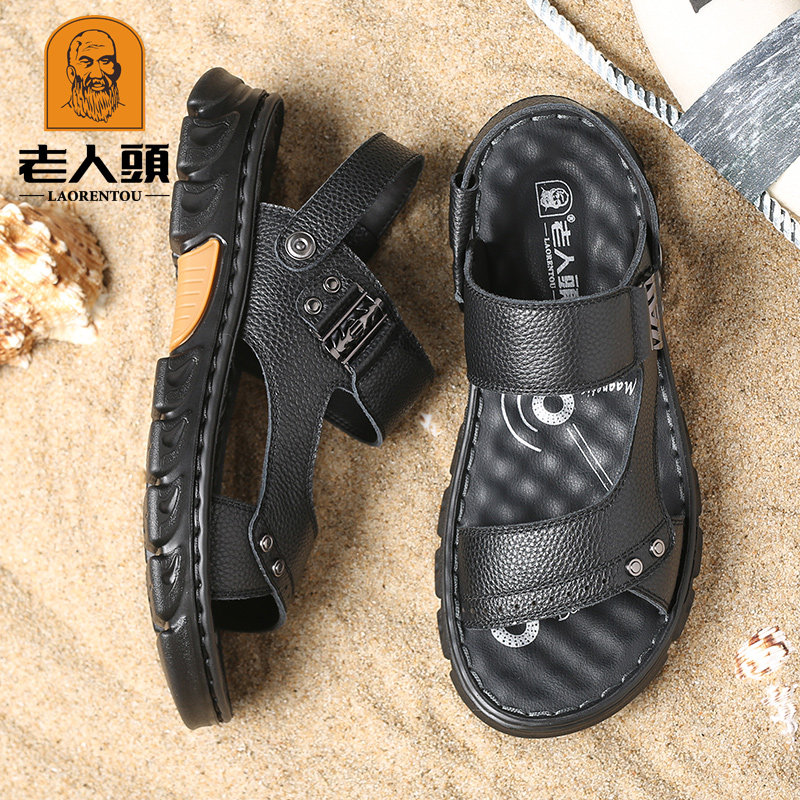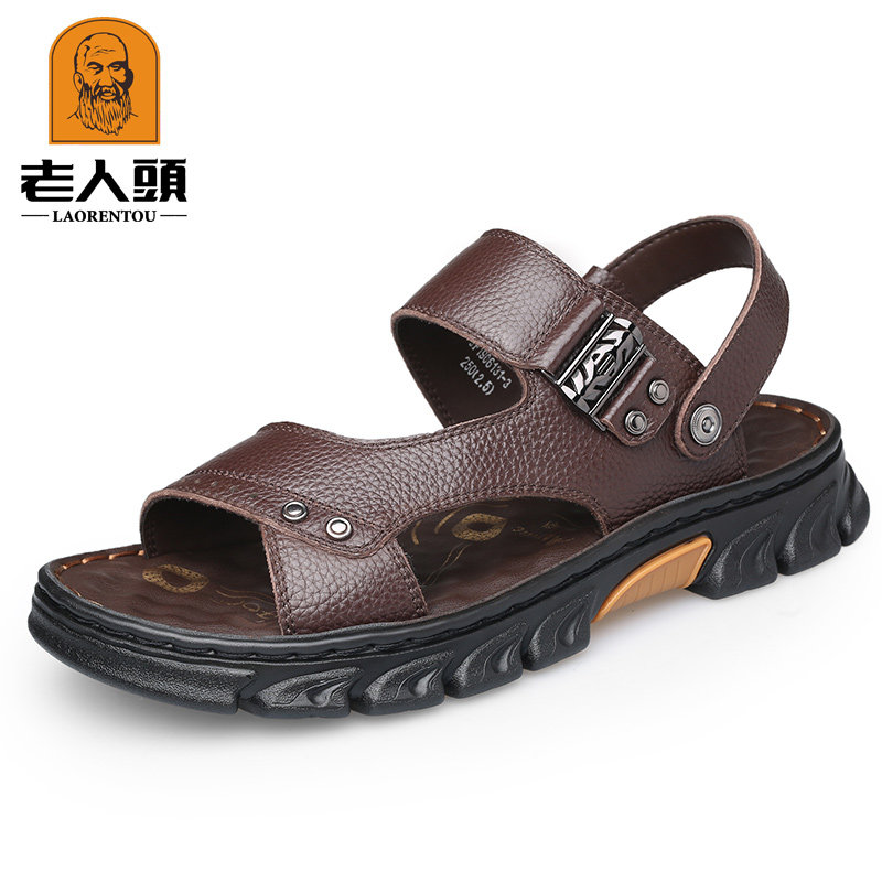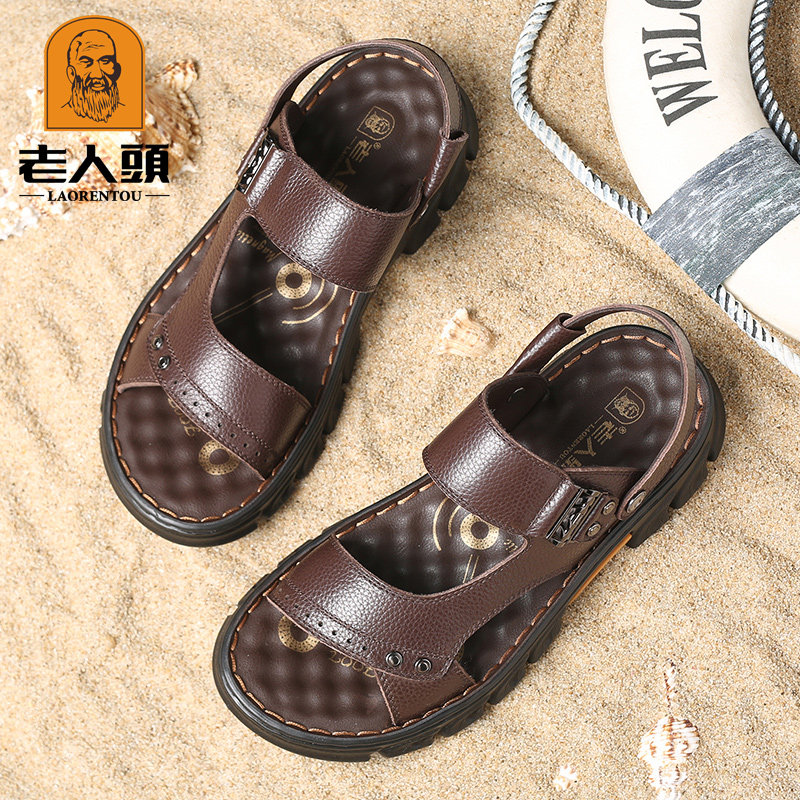 Old man head sandals men 2021 summer cowhide casual beach shoes non-slip thick bottom leather dual-use middle-aged slippers men