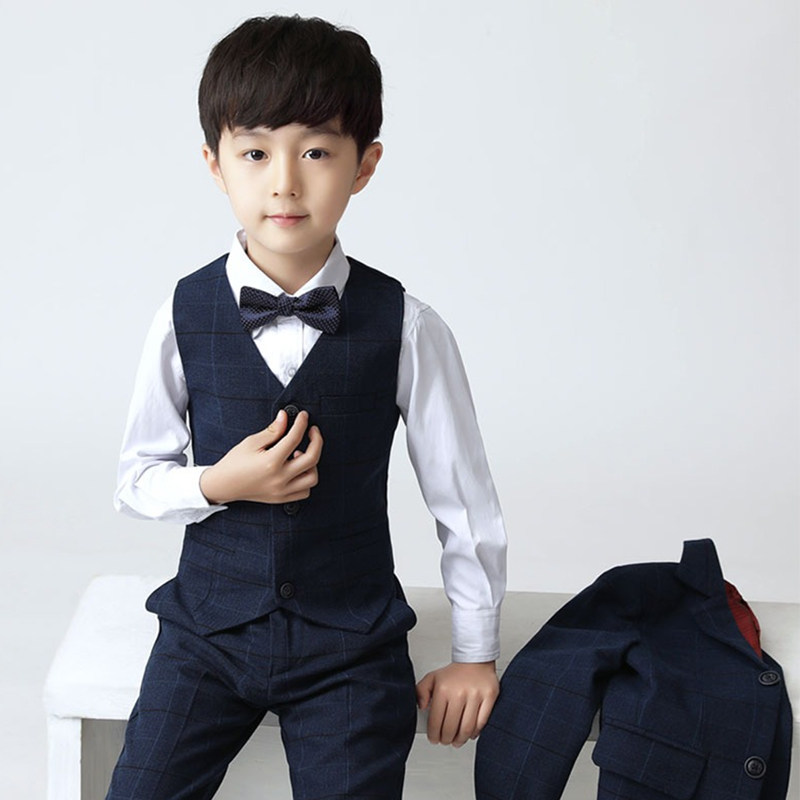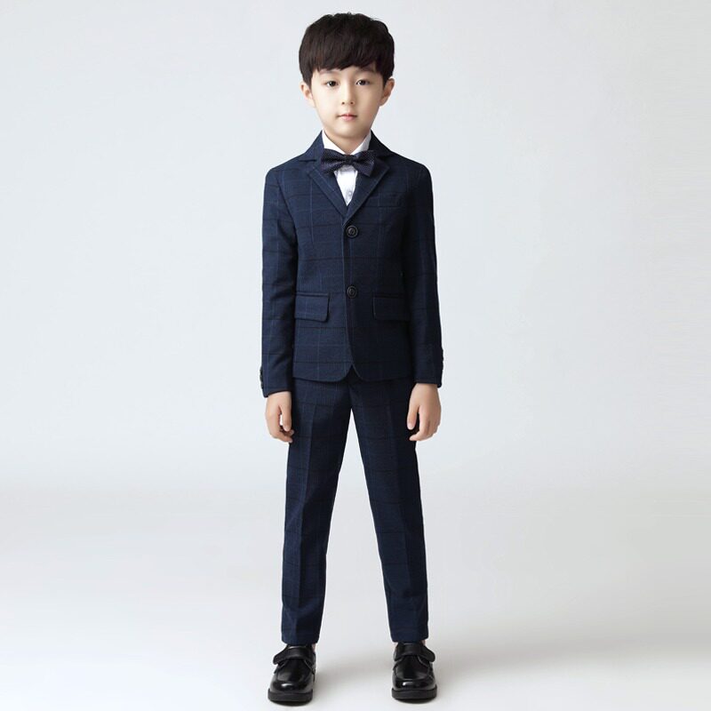 Five-piece dark blue check suit (suit vest, shirt, trousers, bow tie) Four-piece dark blue check suit (suit, trousers, vest, bow tie) Four-piece dark blue check suit (suit, trousers)