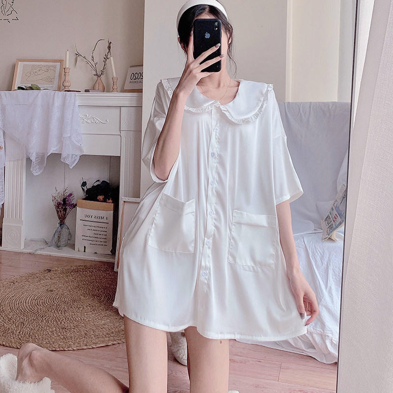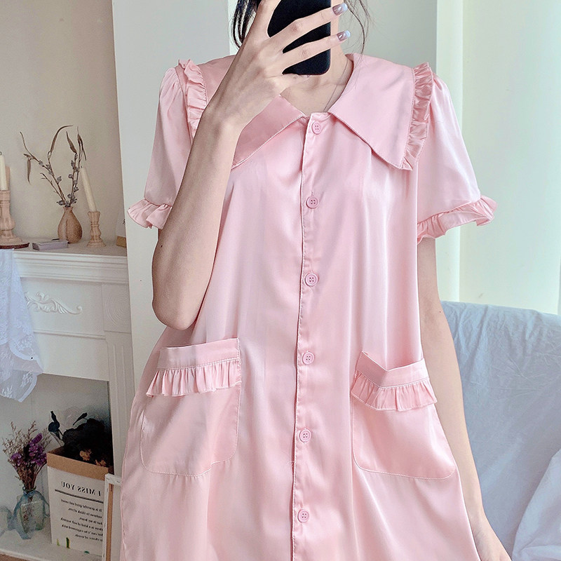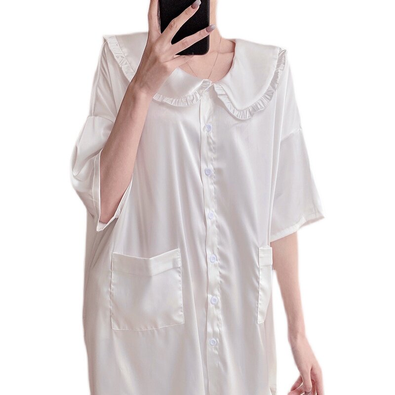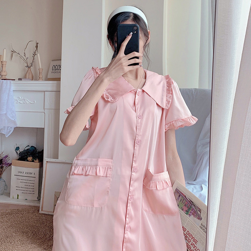 Nightdress women's spring and summer ice silk short-sleeved thin section sweet girl doll collar cardigan Korean version simulation silk loose pajamas