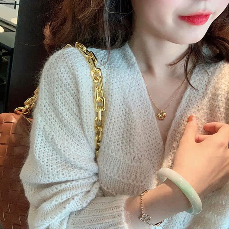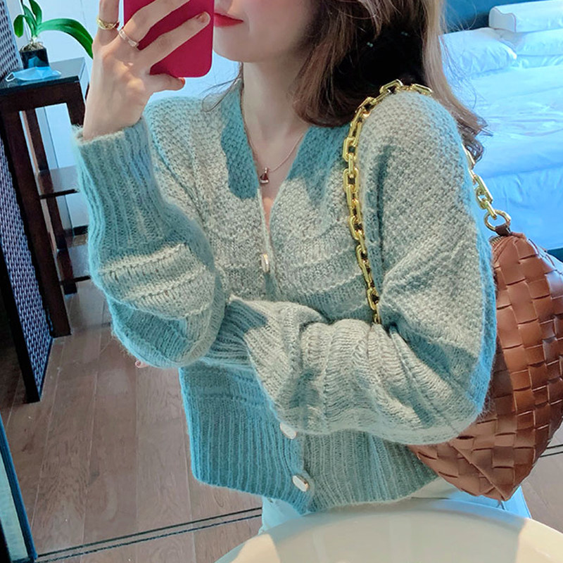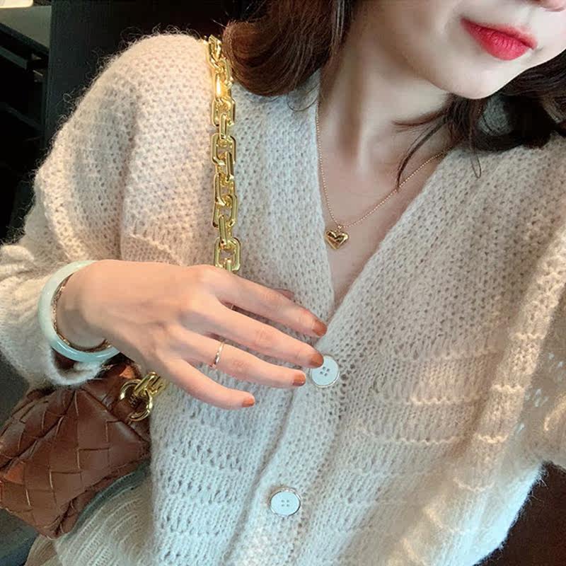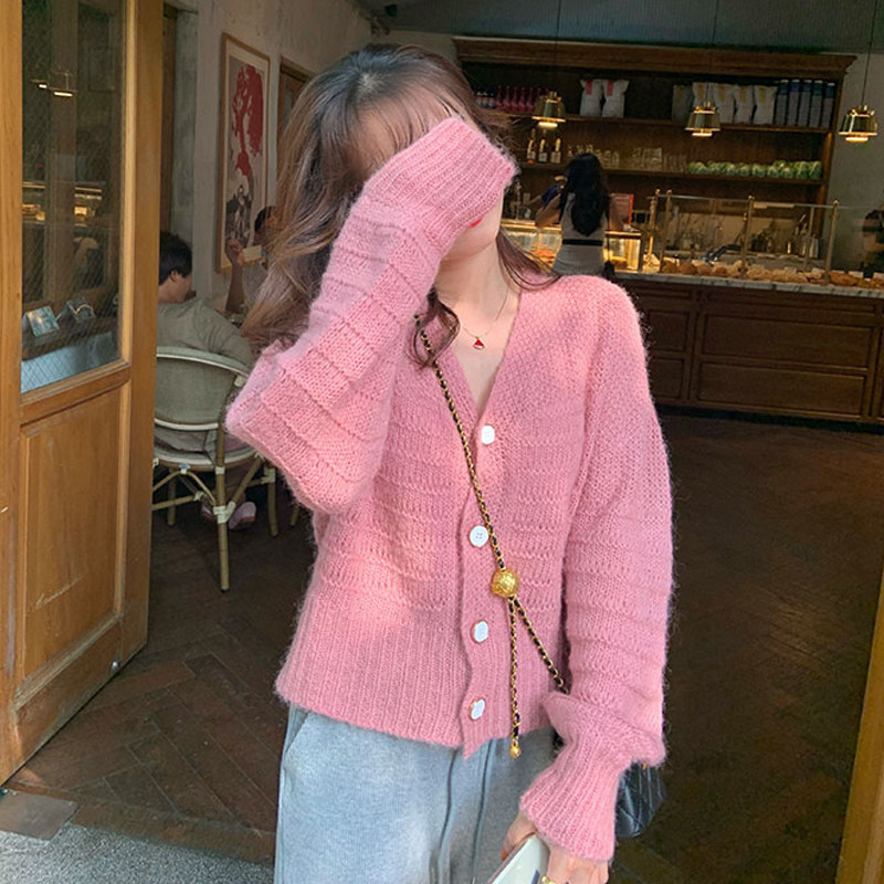 grid studio gentle beige sweater women's knitted small cardigan thin section loose outerwear v-neck short coat
