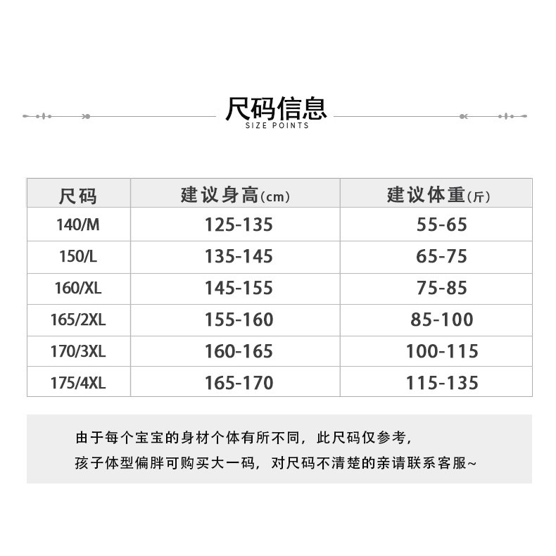 140 M (recommended height 130-140, weight 50-60 kg) 150 L (recommended height 140-150, weight 60-75 kg) 160 XL (recommended height 150-160, weight 75-90 kg) 165 2XL (recommended height 155-165, weight 90-105 kg) 170 3XL (recommended height 160-170, weight 105-120 kg) 175 4XL (recommended height 165-175, Weight 115-135 pounds)