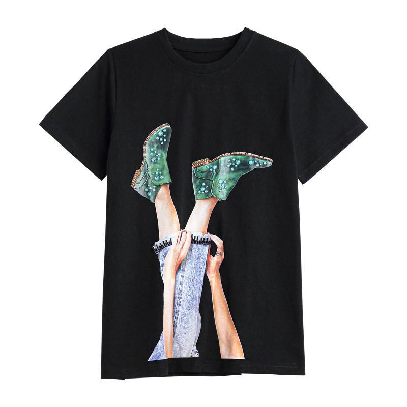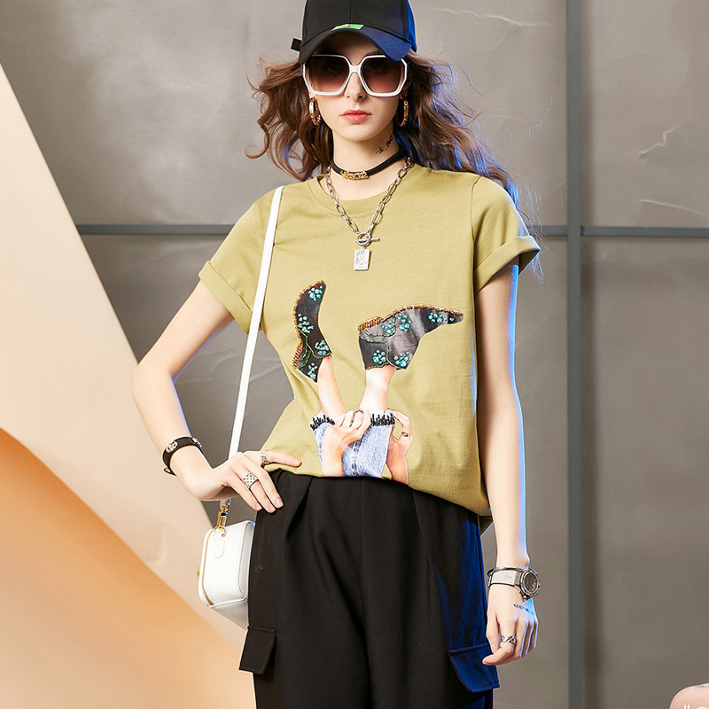 European station white short-sleeved T-shirt women's summer 2022 new Western style with printed beaded loose bottoming shirt trendy